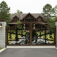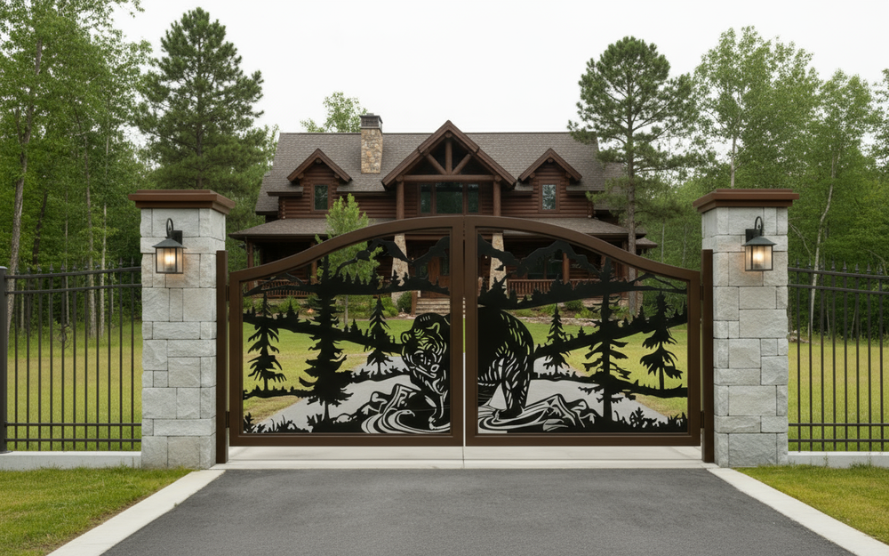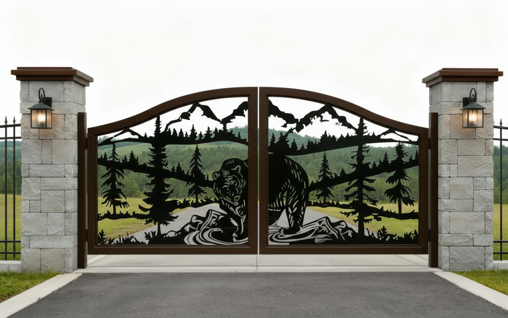 bear silhouette driveway gate, mountain scene wrought iron gate, custom steel entrance gate, Canadian wildlife gate, Taimco decorative gate, nature-inspired estate gate, heavy-duty artistic gate, forest-themed plasma-cut gate