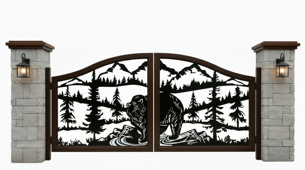Let your entrance roar with presence. Grizzly Hollow features a central bear silhouette standing in a stream, framed by pine trees and mountainous terrain. The scene is plasma-cut with layered depth and clean negative space, creating a gate that feels alive with movement and meaning. Flanked by stone pillars topped with lanterns, this gate is both a functional threshold and a sculptural tribute to wilderness majesty.