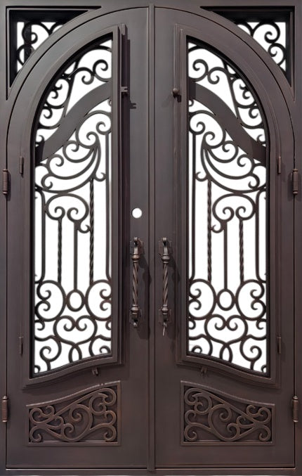 Hand-Forged Ornamental Iron Double Door with Arch and Square Top With kickplate Model # IWD 1108