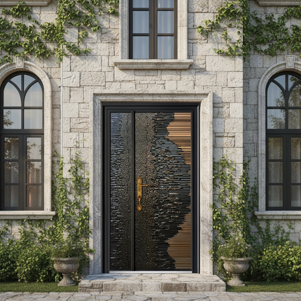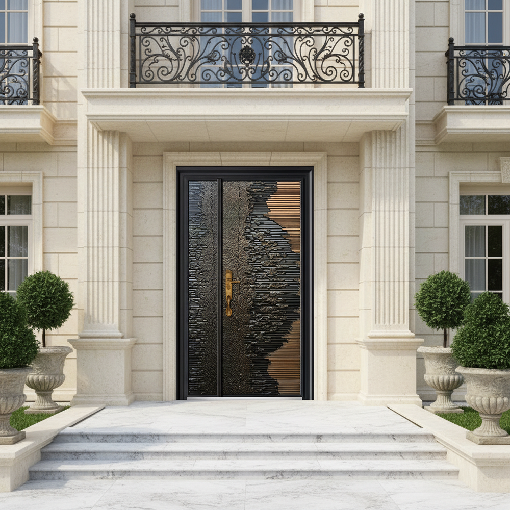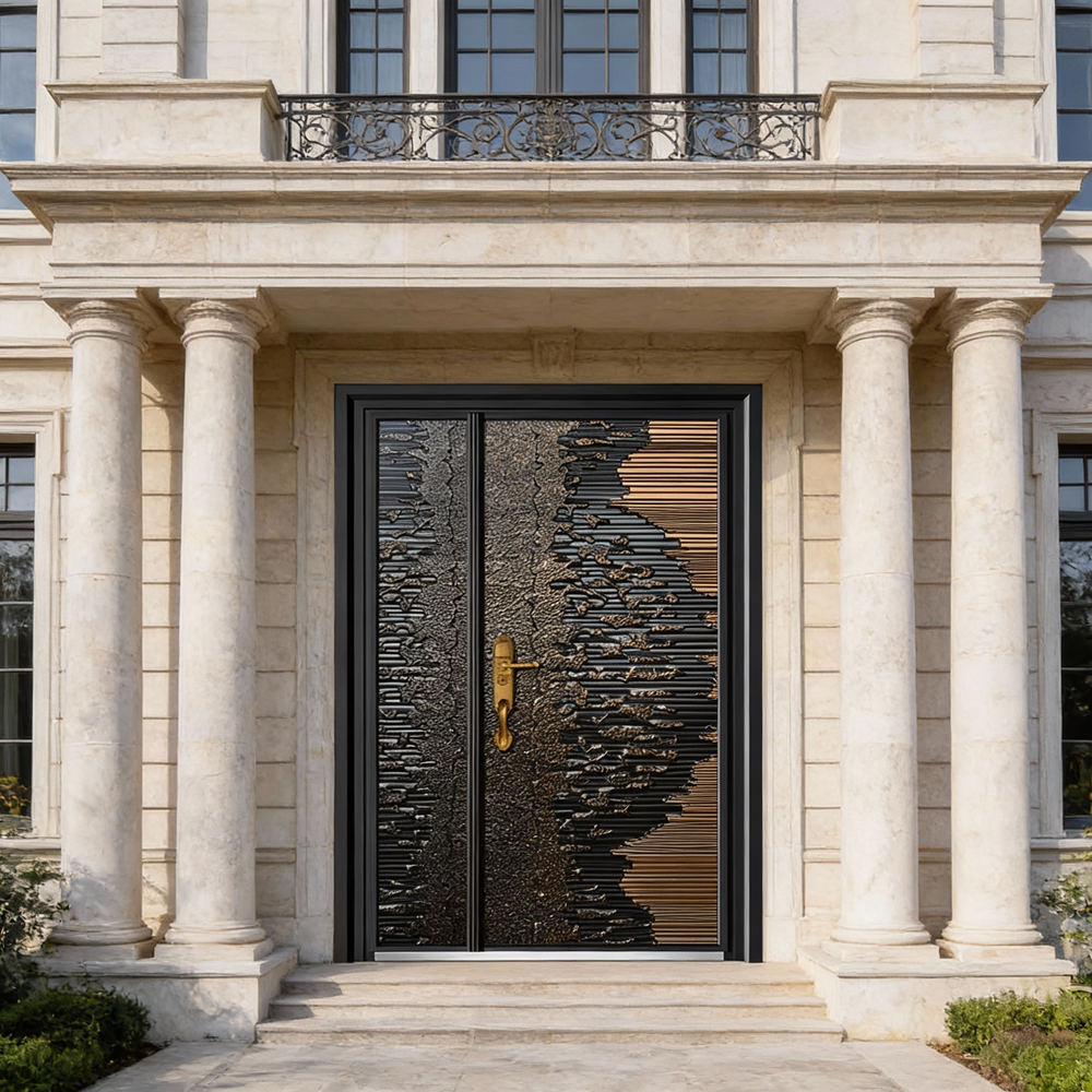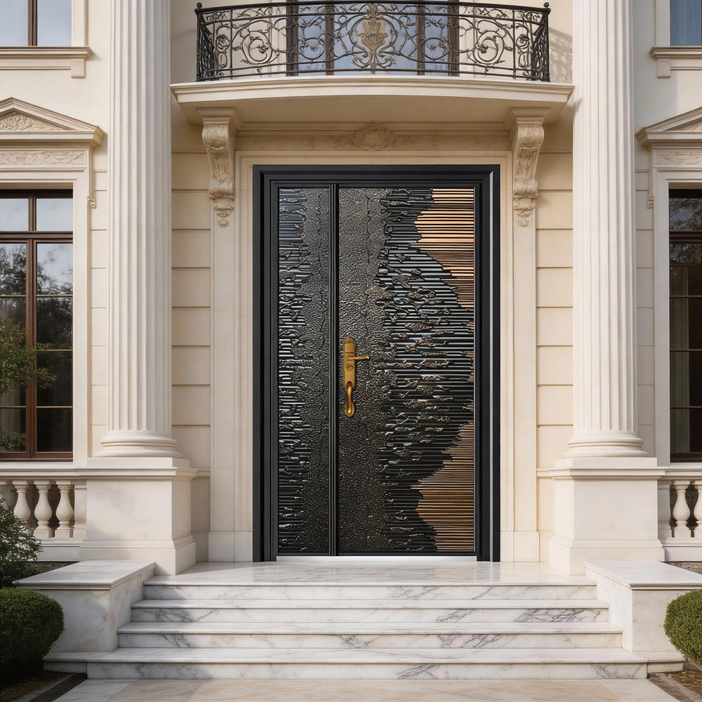 handcrafted steel entry door, gradient texture steel door, industrial bronze metal door, asymmetrical textured steel entry Canada, OBC compliant steel doors, architectural steel entry, custom metal doors, luxury steel front door, Taimco steel doors