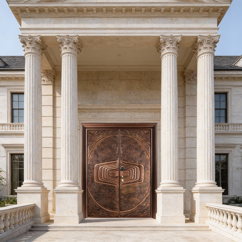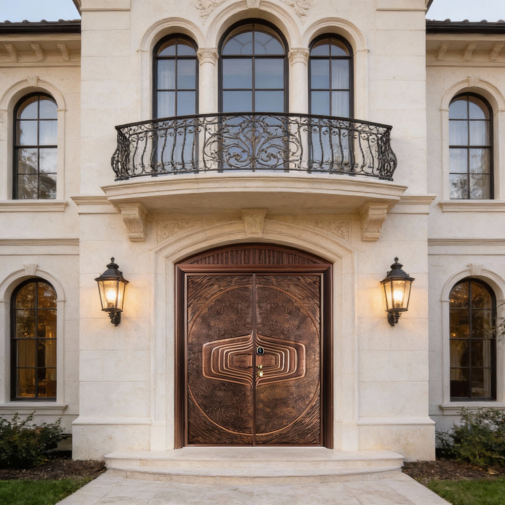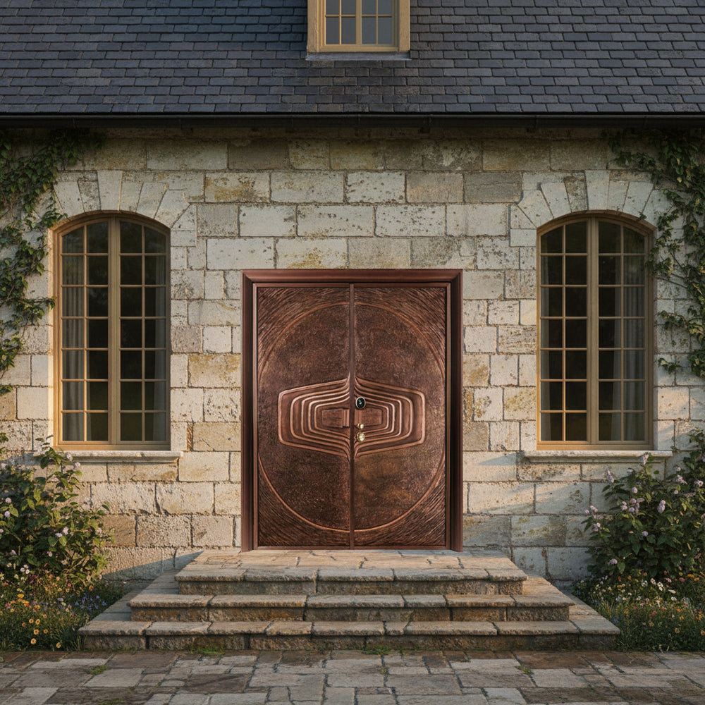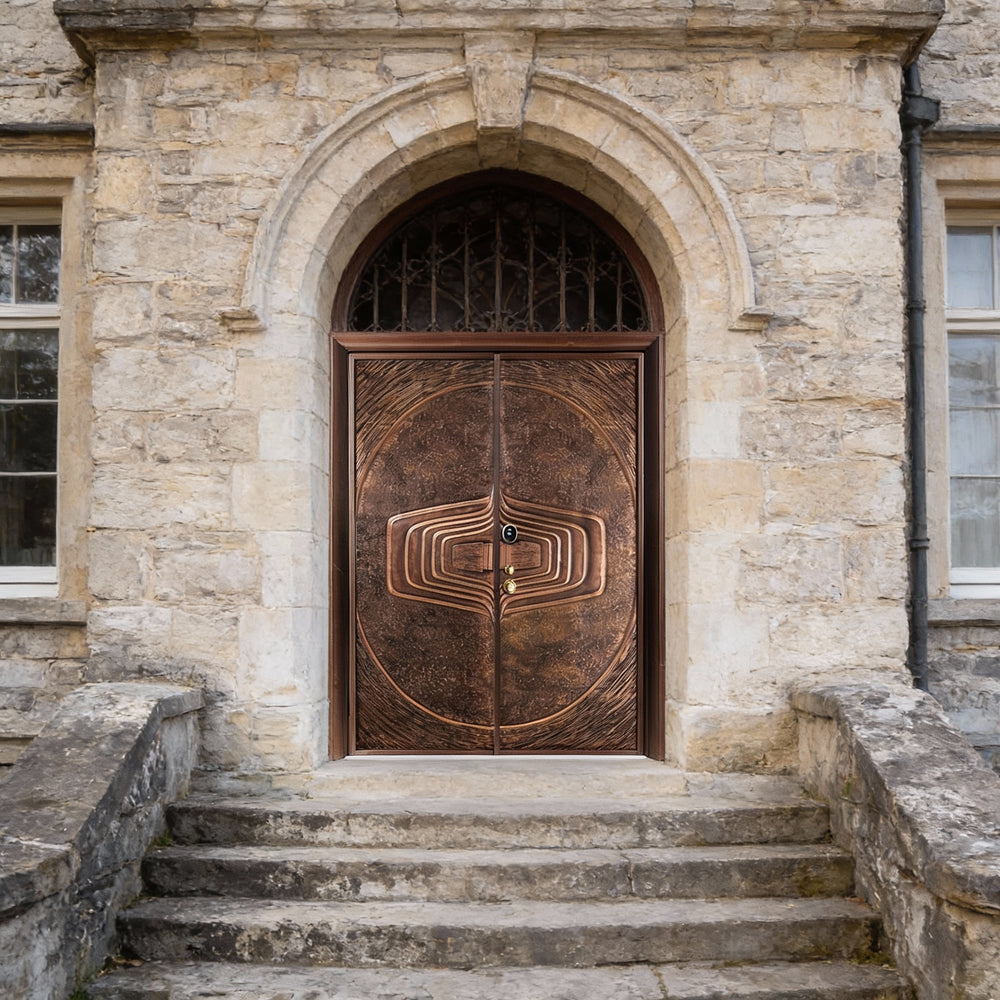 Product Description This handcrafted steel double door features a sculptural, concentric groove design that radiates from a central oval motif, creating a bold architectural statement. The symmetrical layout, matte brown finish, and black frame offer depth, texture, and modern elegance. Built to meet Ontario Building Code (OBC) standards, this entry system combines artistry with structural integrity, making it ideal for luxury homes and custom-designed spaces.
