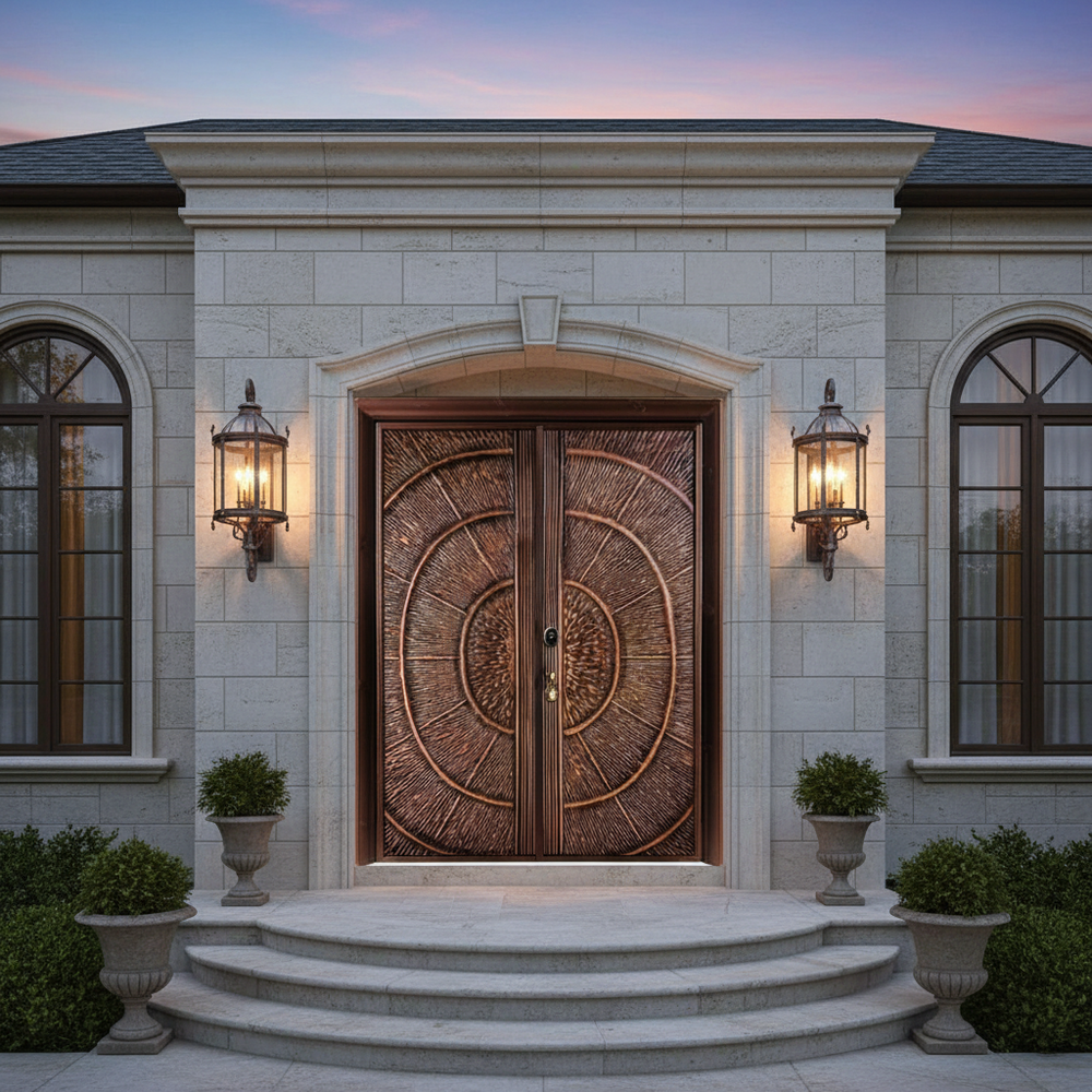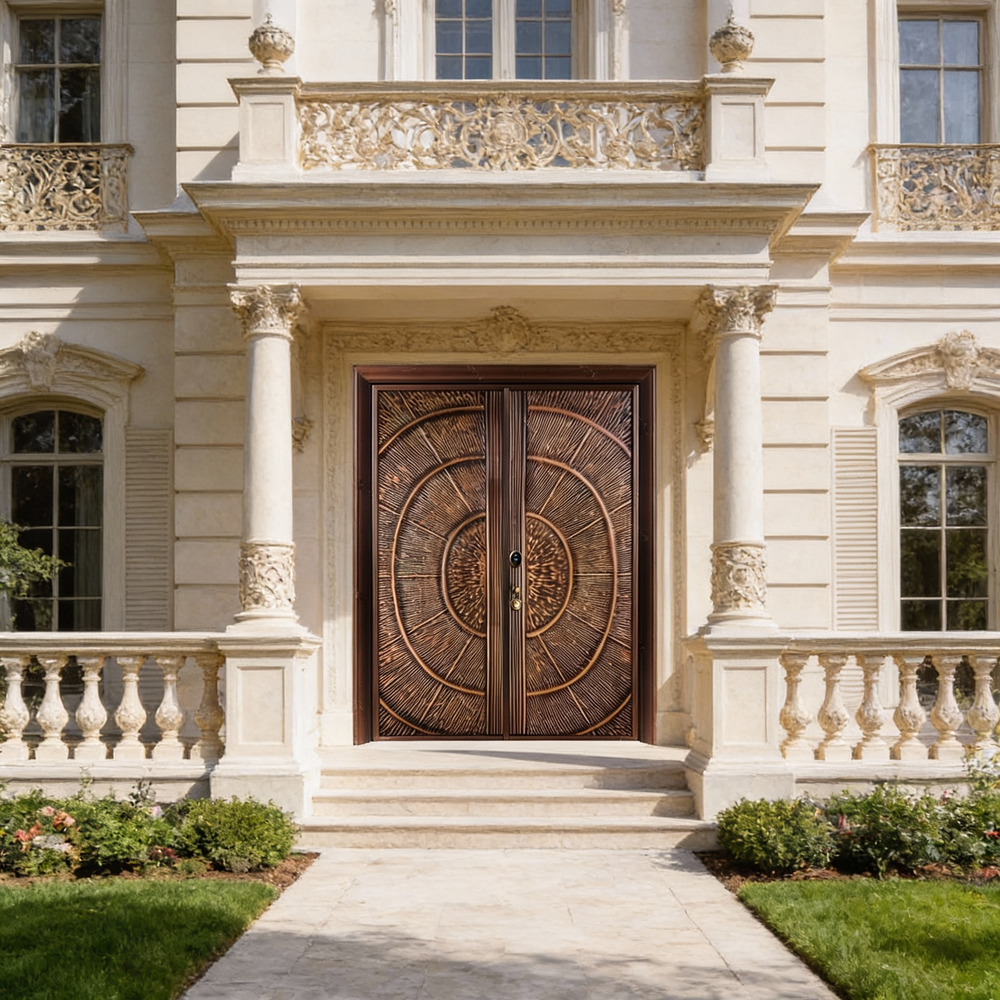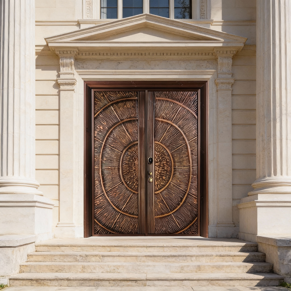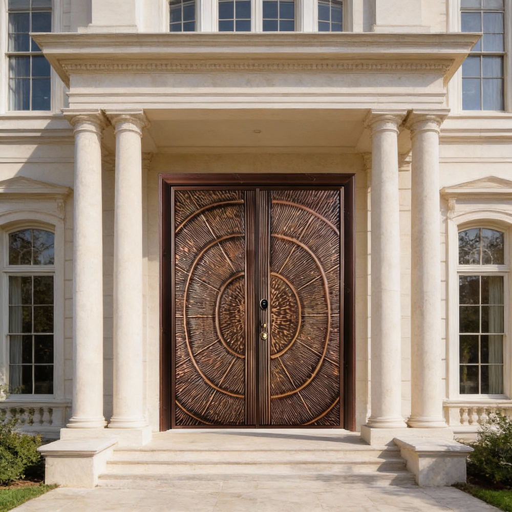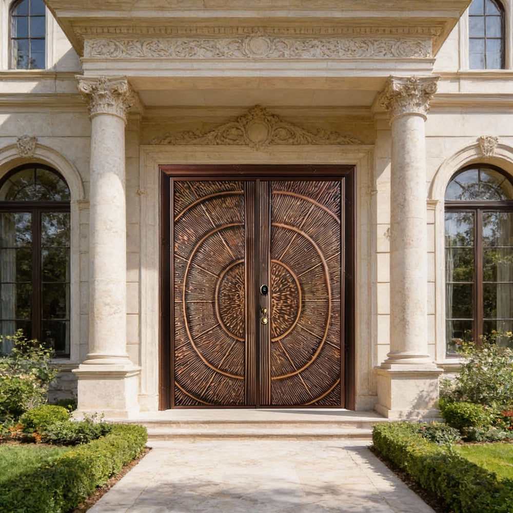 Handcrafted Steel Double Entry Door with Concentric Circle Motif – Bronze Textured Finish Model # C3DC1105