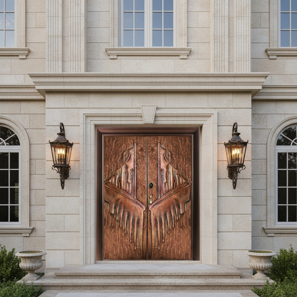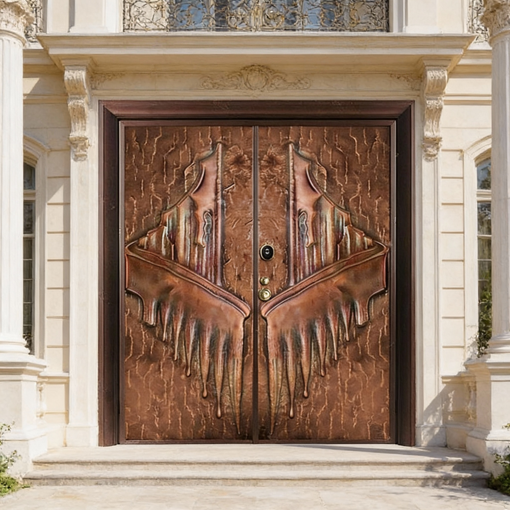 This handcrafted steel double door transforms functional architecture into sculptural fantasy. The symmetrical design evokes melting wings or dripping feathers, rendered in earthy bronze tones with hints of red and blue for a surreal metallic effect. The central seam includes a peephole and locking system, seamlessly integrated into the flowing composition. Built to meet Ontario Building Code standards, this entry system offers long-term durability, weather resistance, and dramatic visual impact for luxury homes, artistic builds, or fantasy-inspired estates.