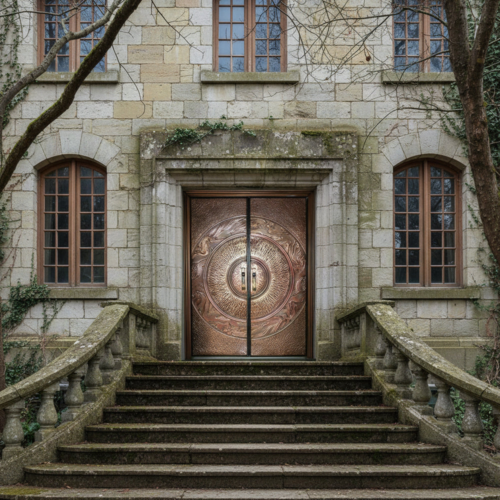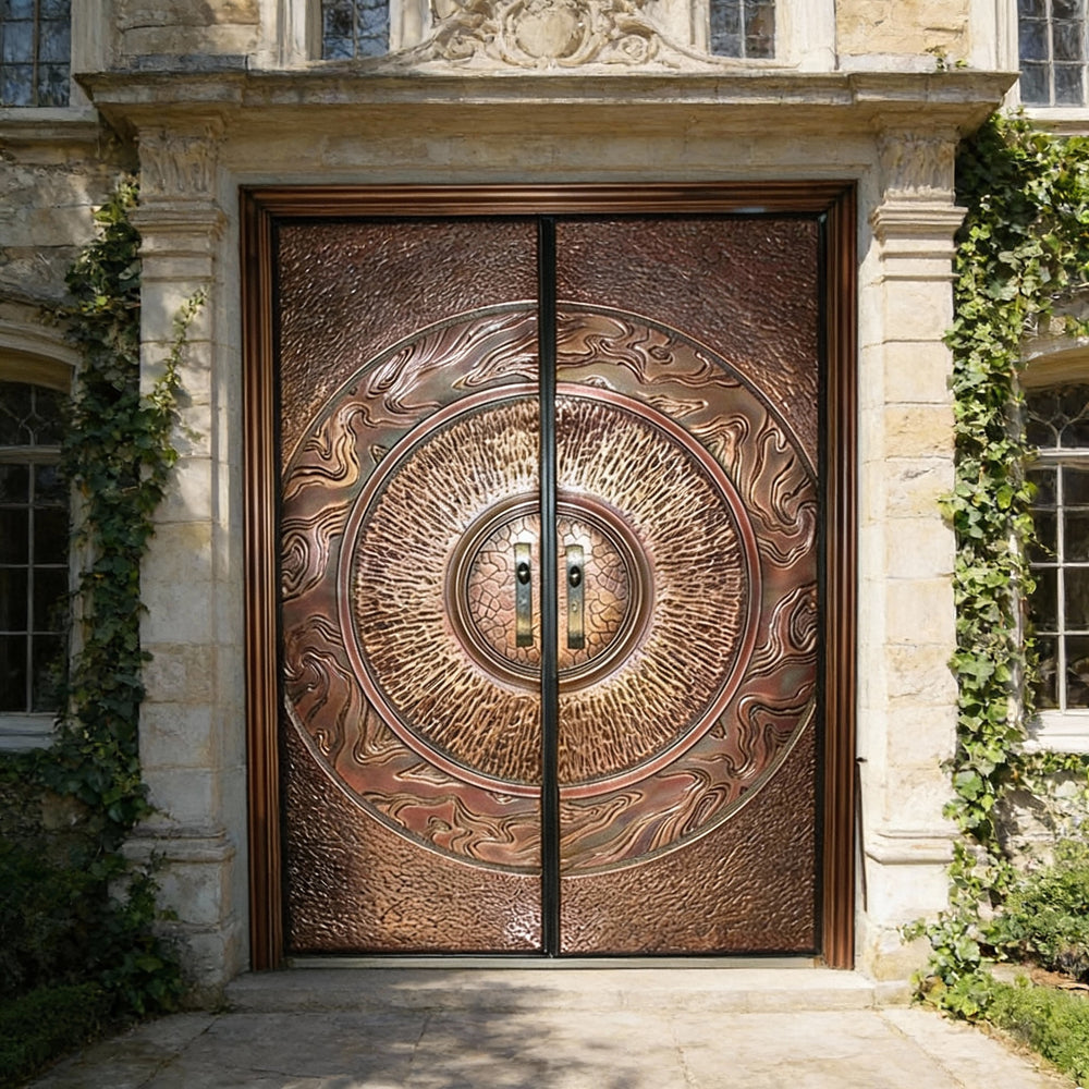 This handcrafted steel double door features a dramatic concentric medallion design that spans both panels, forming a unified sunburst motif with swirling bronze textures and radial grooves. The central handles are symmetrically placed within the circular artwork, blending functionality with sculptural elegance. Engineered to meet Ontario Building Code standards, this door offers long-term durability, weather resistance, and architectural impact for luxury residences, cultural buildings, or design-forward estates.
