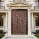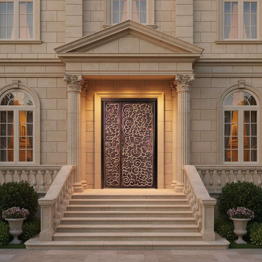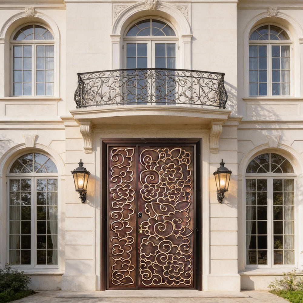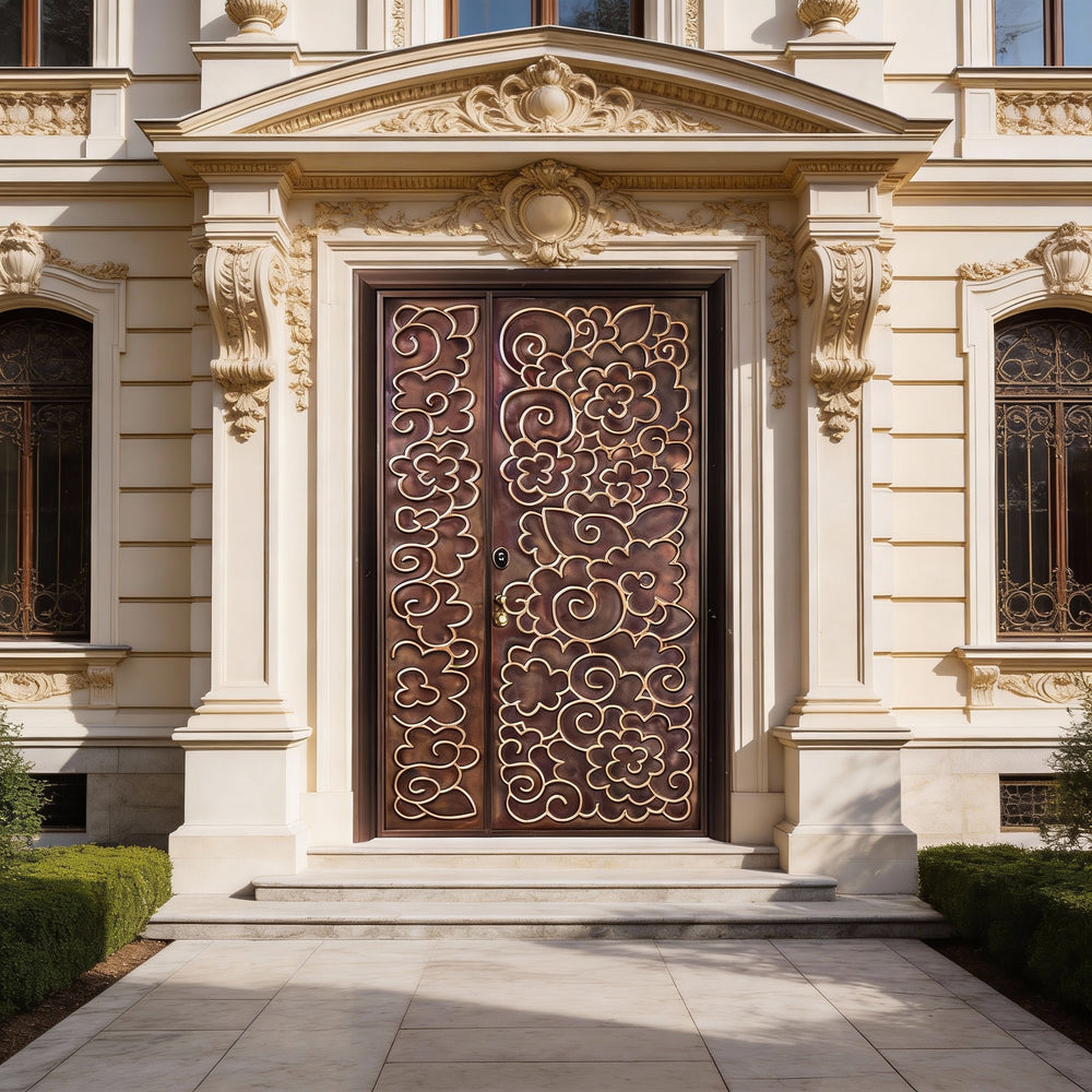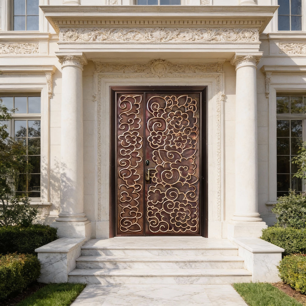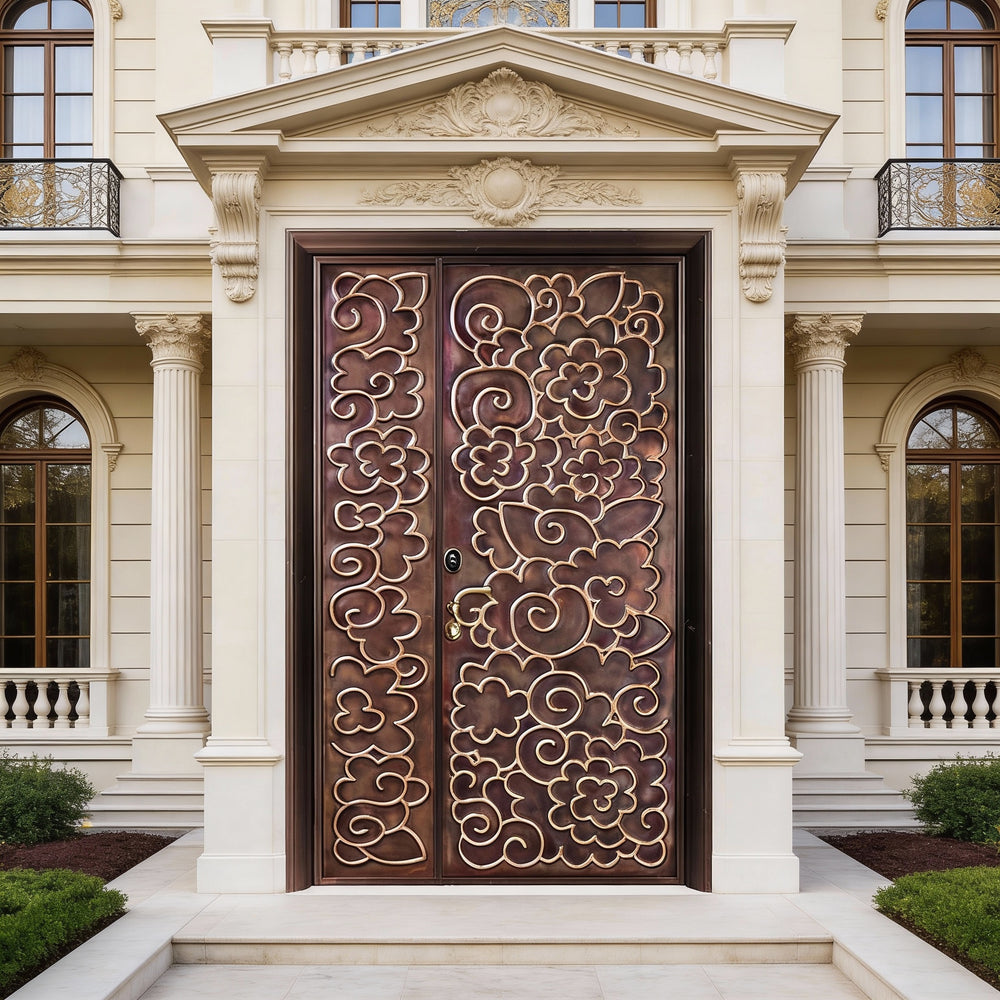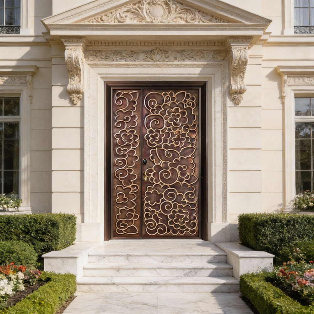 This handcrafted steel entry door features a richly detailed floral and swirl motif, etched across asymmetrical panels for a dynamic visual composition. The left panel is narrower than the right, yet both share a cohesive ornamental style with raised outlines and flowing curves. Finished in a bronze tone, the door blends elegance with craftsmanship, making it ideal for luxury residences, boutique spaces, or culturally inspired architecture. Built to meet Ontario Building Code standards, this entry system offers long-term durability, weather resistance, and artistic impact.