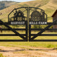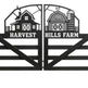 - Design: Barns, trees, and custom text ("HARVEST HILLS FARM")