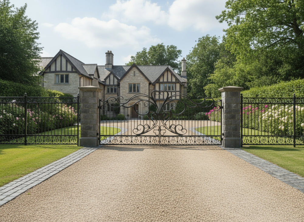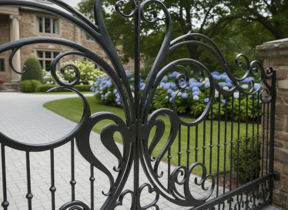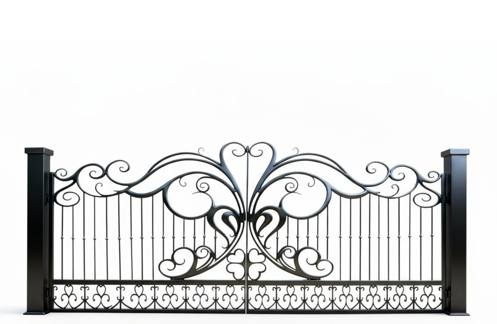 A gate that opens with grace. Heart wing Elan features dual swing panels adorned with elegant curves, vertical bars, and symmetrical flourishes that evoke butterfly wings and stylized foliage. The top arch is crowned with flowing scrolls, while the bottom anchors the design with mirrored ornamental accents. Flanked by sturdy black pillars, this gate blends romantic charm with structural strength.