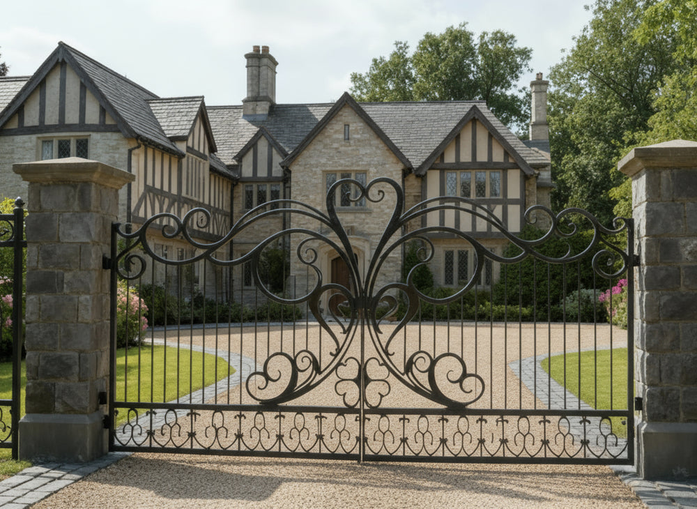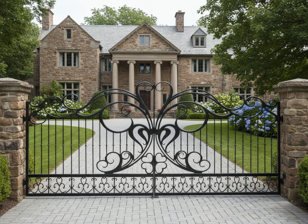 heart scroll wrought iron gate, butterfly wing estate gate, romantic ornamental gate, Canadian custom gate, Taimco decorative gate, black pillar entrance gate, heavy-duty artistic gate, luxury driveway gate design