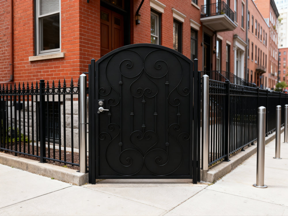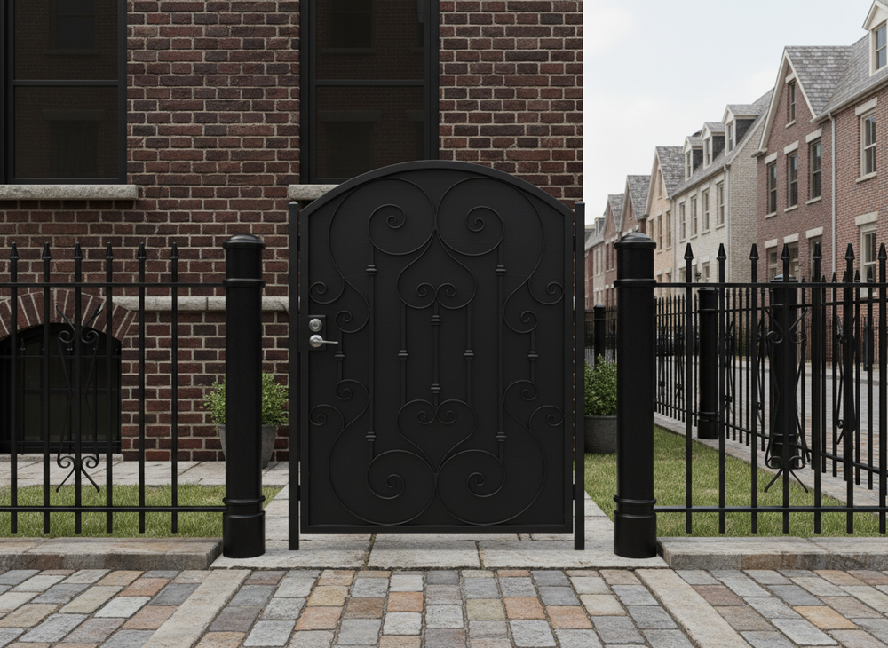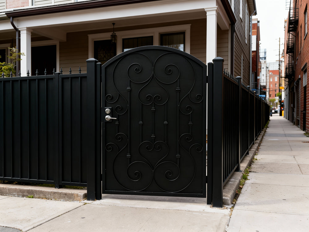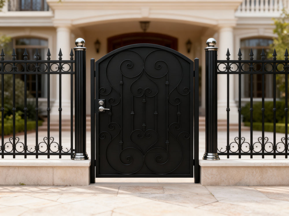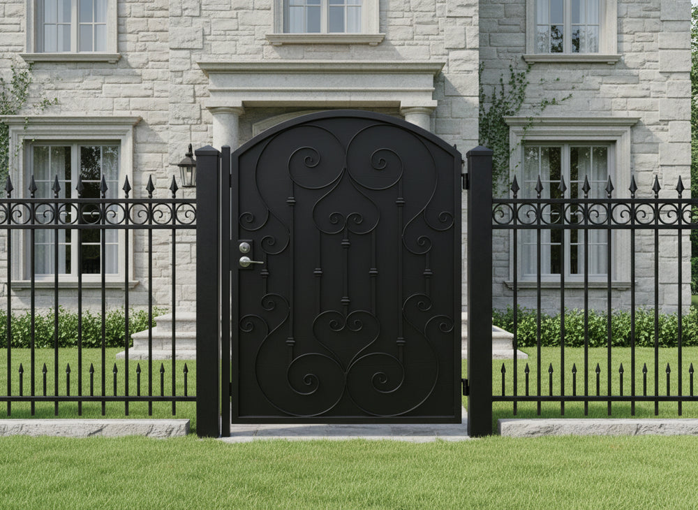 A door that greets with grace. Heartspire Passage features a single swing panel crowned with an arched top and adorned with symmetrical scrollwork, heart-like flourishes, and floral spirals. Designed for garden entries, residential walkways, or courtyard transitions, this man door blends romantic ornamentation with secure craftsmanship—ideal for enhancing curb appeal with timeless charm.