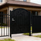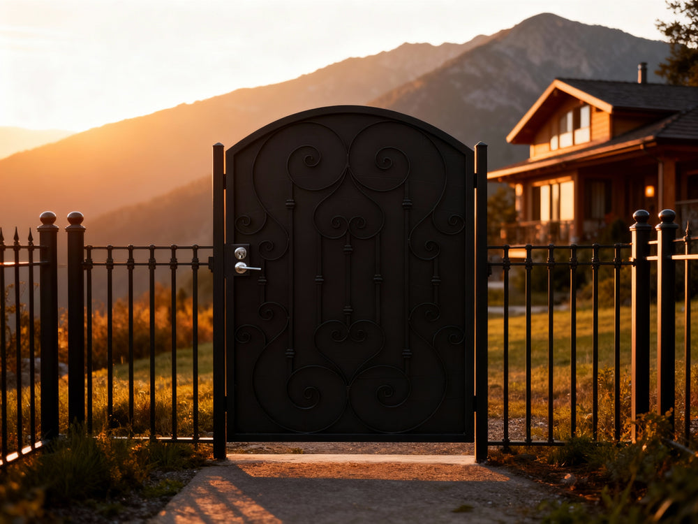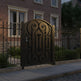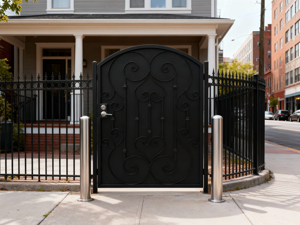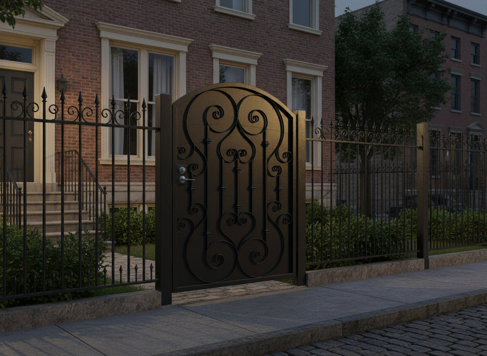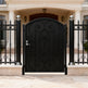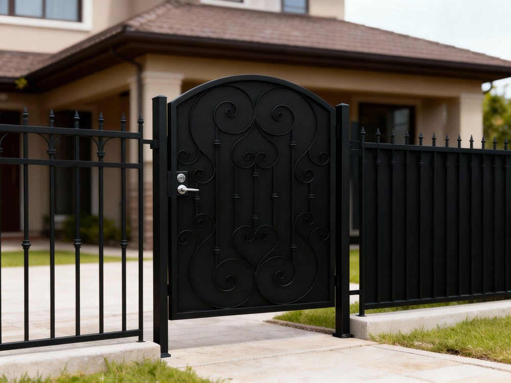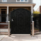 A door that greets with grace. Heartspire Passage features a single swing panel crowned with an arched top and adorned with symmetrical scrollwork, heart-like flourishes, and floral spirals. Designed for garden entries, residential walkways, or courtyard transitions, this man door blends romantic ornamentation with secure craftsmanship—ideal for enhancing curb appeal with timeless charm.