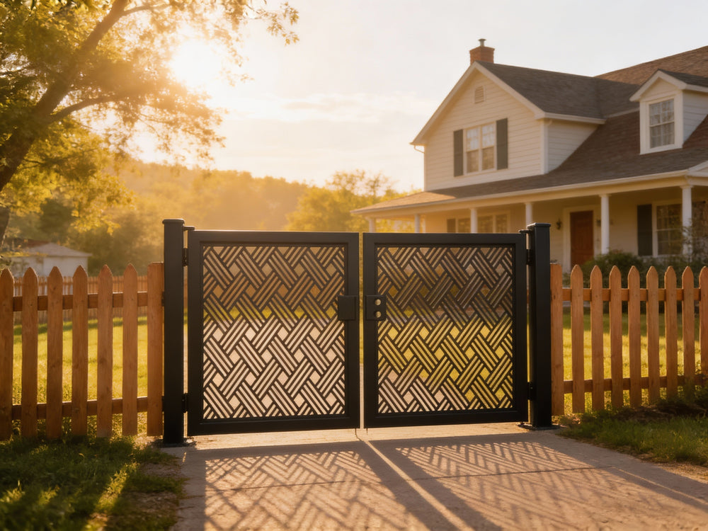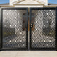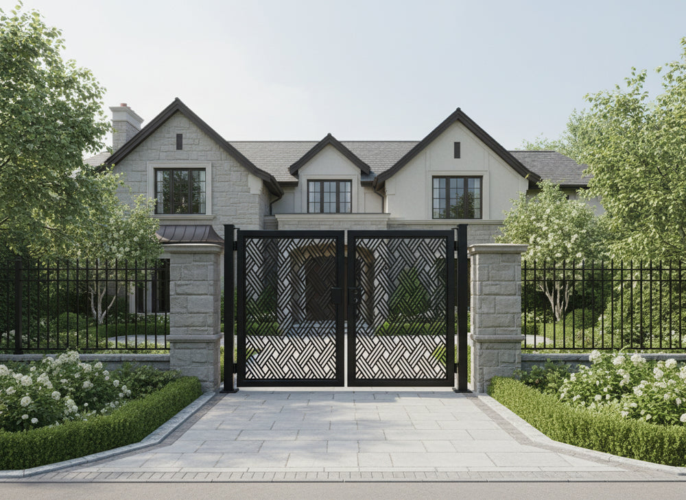 herringbone lattice man door, geometric metal gate, diagonal pattern garden entry, Canadian custom gate, Taimco Herringveil Passage model, manual operation decorative door