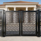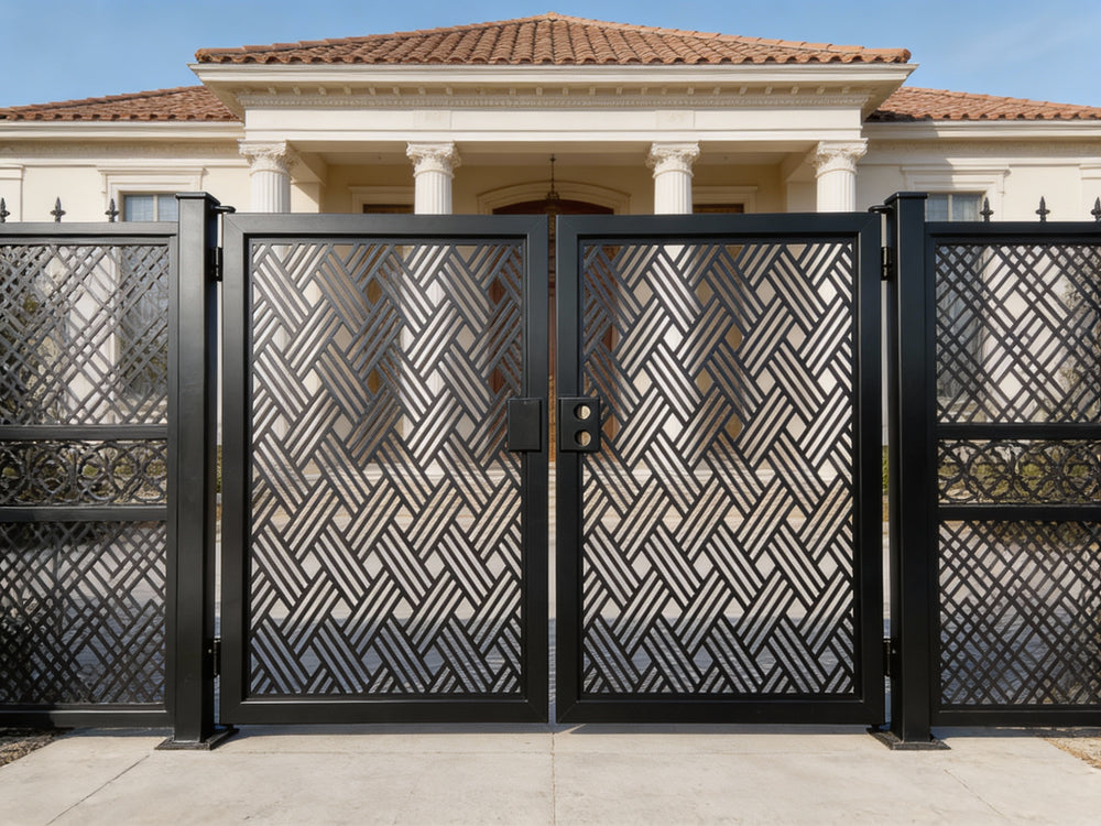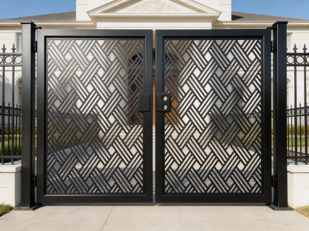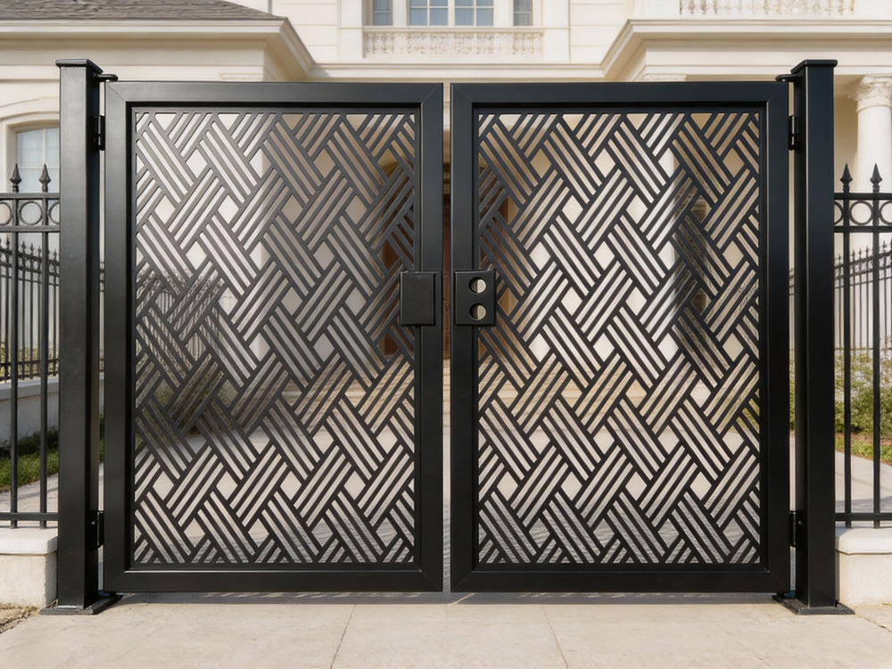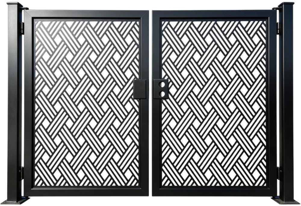 A door that weaves strength into symmetry. Herringveil Passage features two mirrored panels framed in matte black, each showcasing a bold herringbone lattice of interwoven diagonal lines. The central lock plate with circular accents adds a touch of industrial precision. Ideal for residential walkways, garden entries, or commercial transitions, this man door blends contemporary geometry with secure craftsmanship.