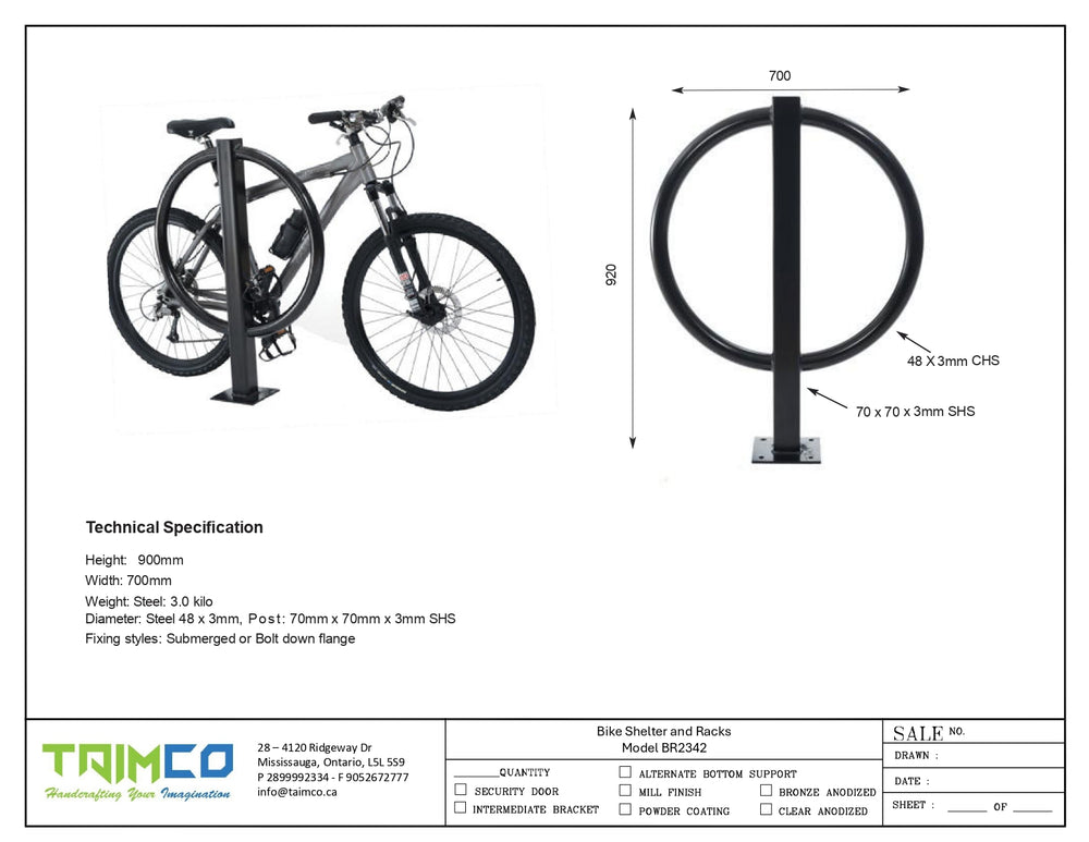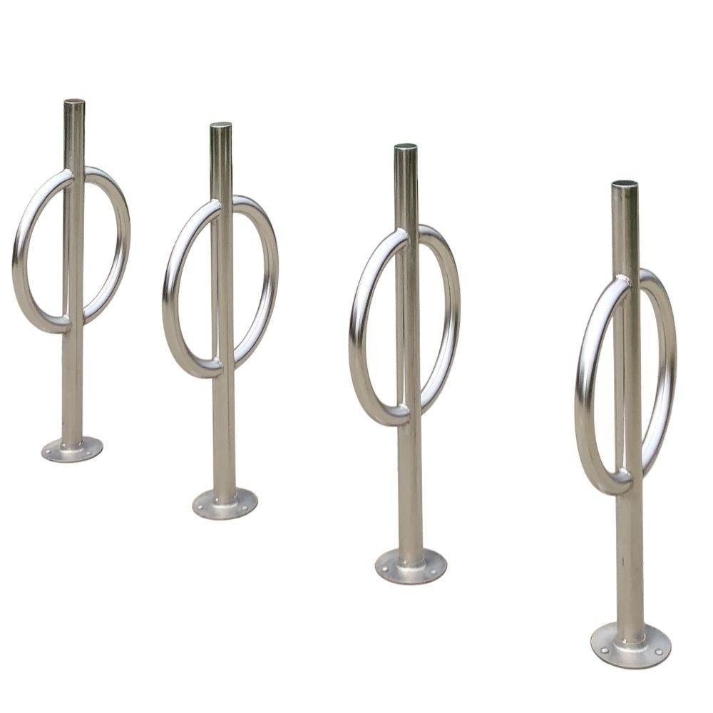 TAIMCO Post and Ring bicycle racks are available in a galvanized, powder coat, or electropolish stainless steel finish.