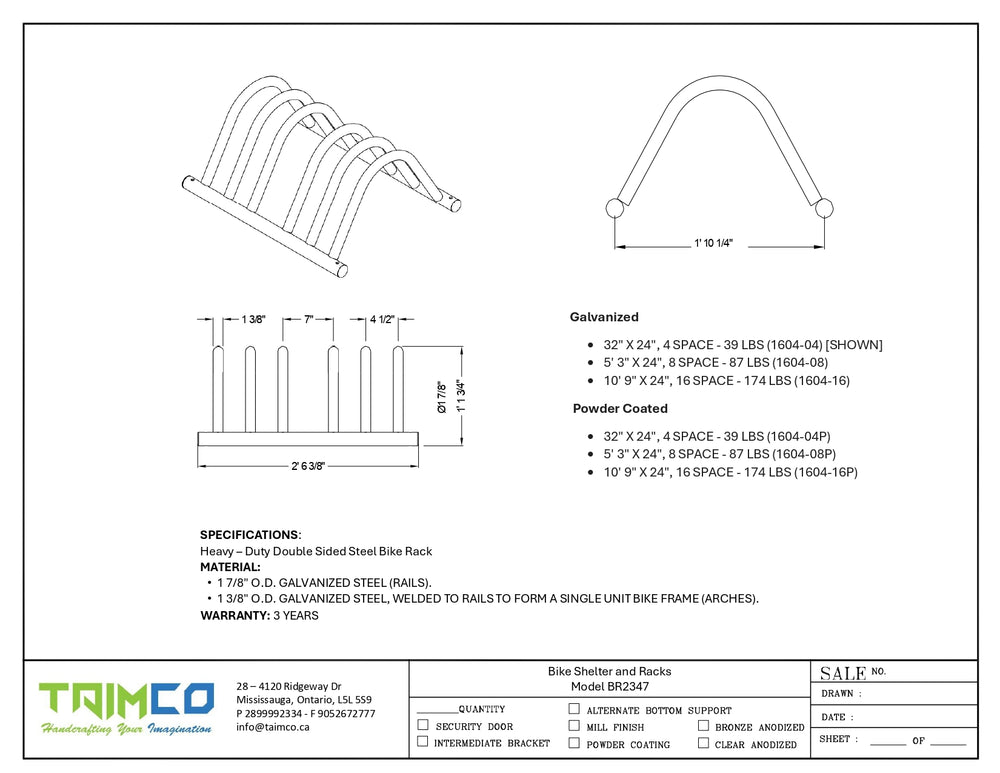 This heavy-duty bike Bumper Shape stand is designed to accommodate up to 10 to 15 bicycles and is suitable for commercial use. It can be used as a single- or double-sided unit and can accommodate most bike tire sizes. The stand is constructed from rugged steel tubing and features a welded grid and side rails that provide strength and stability. The side rails tubes have a diameter of 1-1/2" and are made from 14-gauge steel.