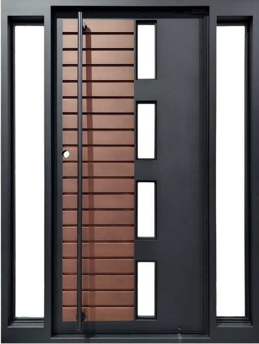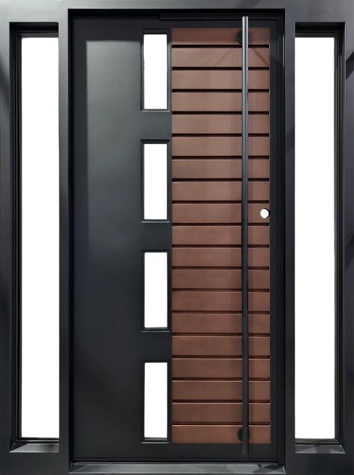 steel woodgrain entry door, hybrid metal door with glass, modern steel front door, matte black architectural door, custom steel door with slats, residential steel entry Canada, door with sidelights and vertical glass, premium iron door, industrial chic front door, solid steel door with warm design.