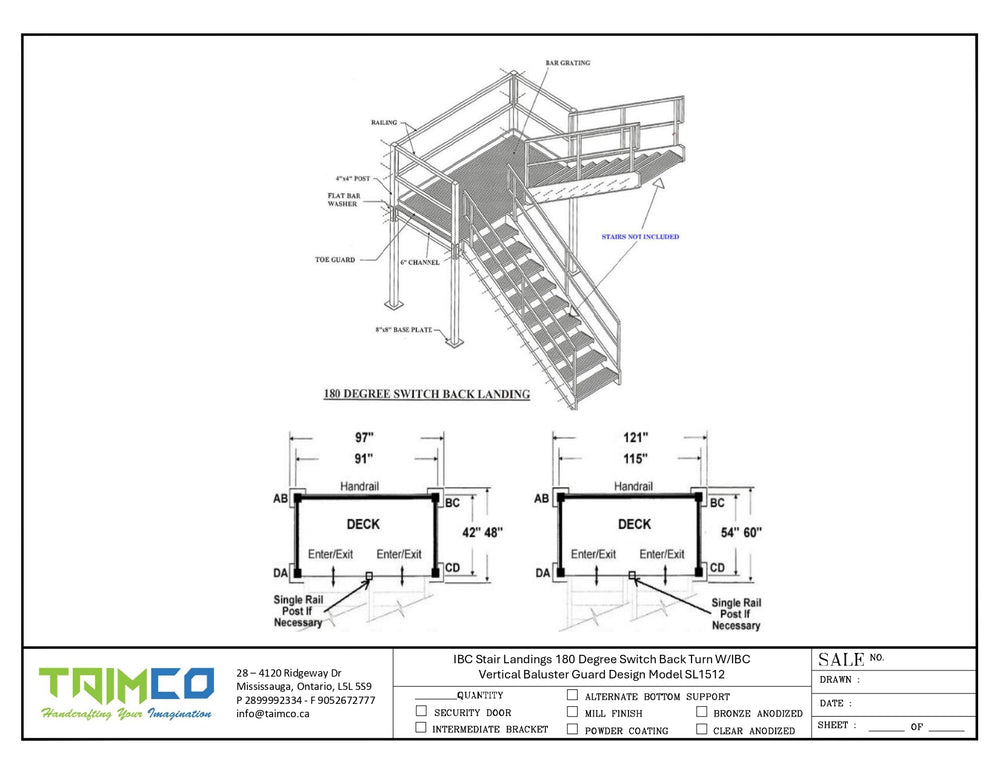 IBC Stair Landings with a 180 Degree Switch Back Turn and IBC Vertical Baluster Guard Design are specifically engineered to meet stringent building codes and safety standards. These stair landings are ideal for industrial and commercial environments, providing a robust and space-efficient solution for vertical navigation. The switchback design allows for a 180-degree turn, optimizing space usage while ensuring safety and compliance.
