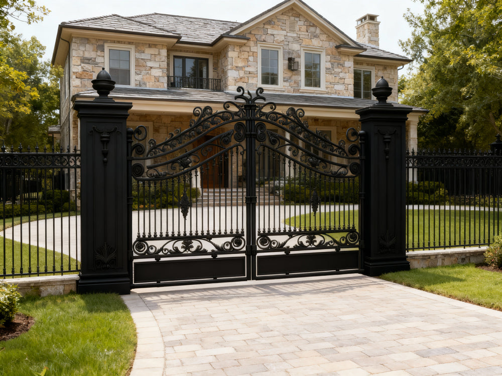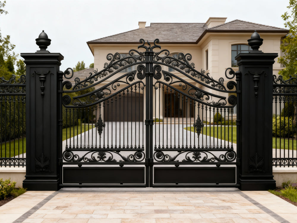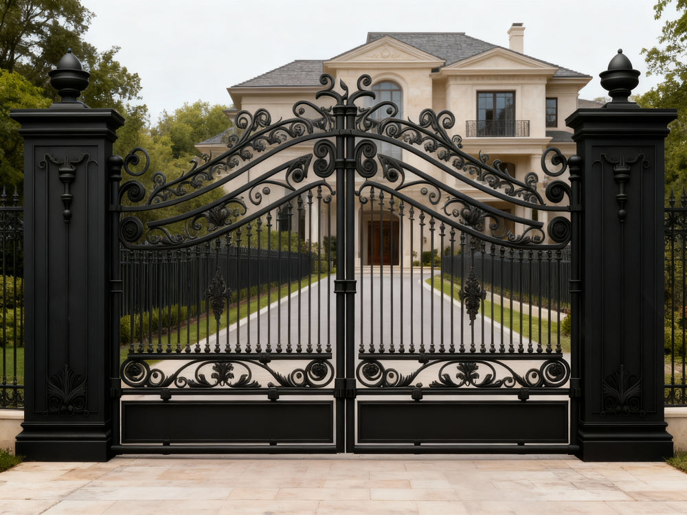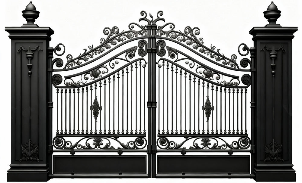 Command attention with the Imperial Grace gate—an exquisitely handcrafted wrought iron masterpiece designed to elevate the entrance of any luxury estate. Featuring sweeping scrollwork, floral motifs, and pointed finials, this symmetrical double-panel gate is a tribute to timeless elegance and architectural grandeur.