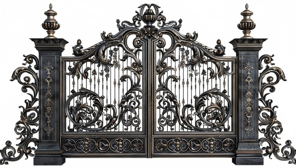 Ornamental wrought iron gate, decorative entrance gate, luxury estate fencing, handcrafted metal gate, artistic ironwork, premium security gate, custom wrought iron gates