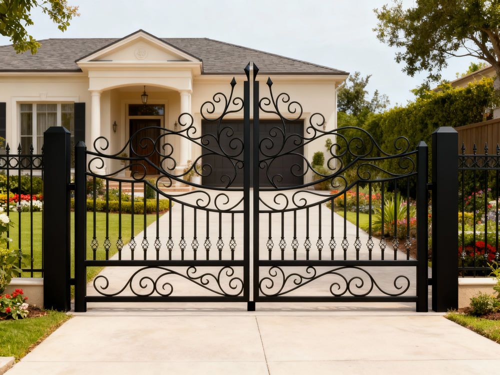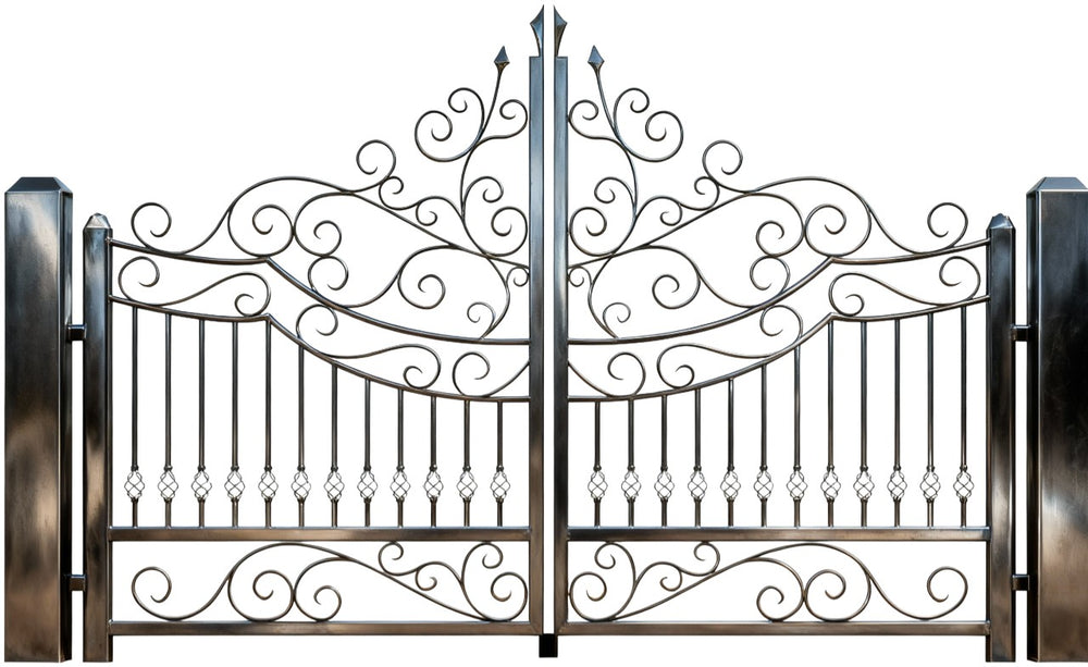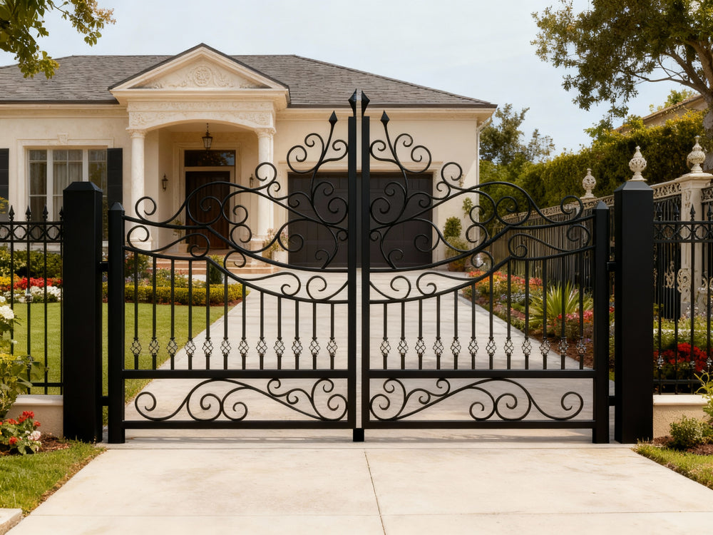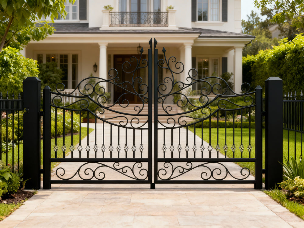 Make a bold and graceful statement with Ironspire Elegance, a double-panel wrought iron driveway gate featuring symmetrical scrollwork, diamond embellishments, and pointed finials. Designed for estates, formal gardens, or upscale residences, this gate offers timeless beauty and robust security in one cohesive design.