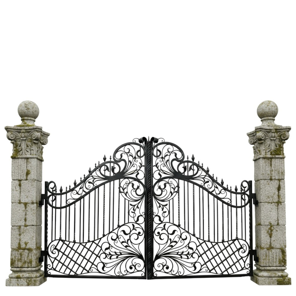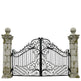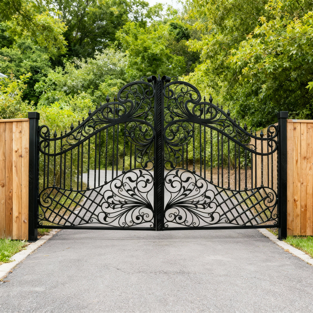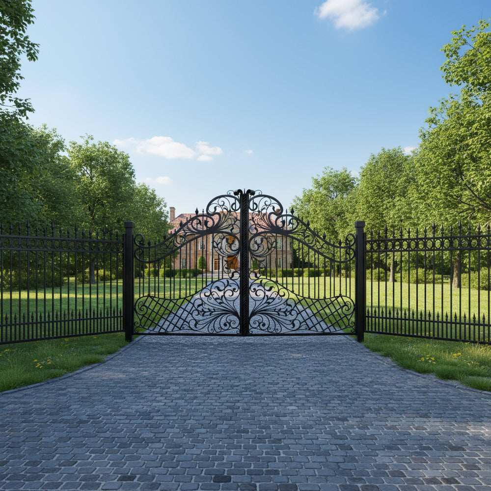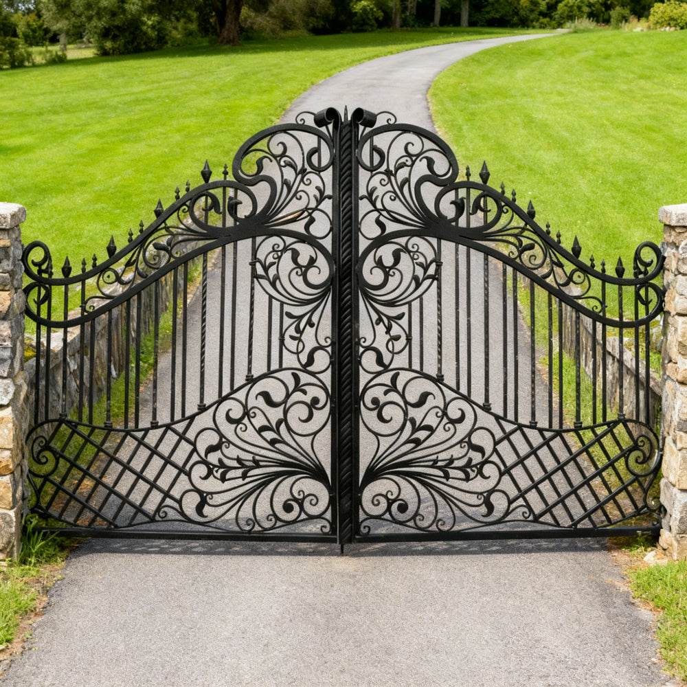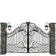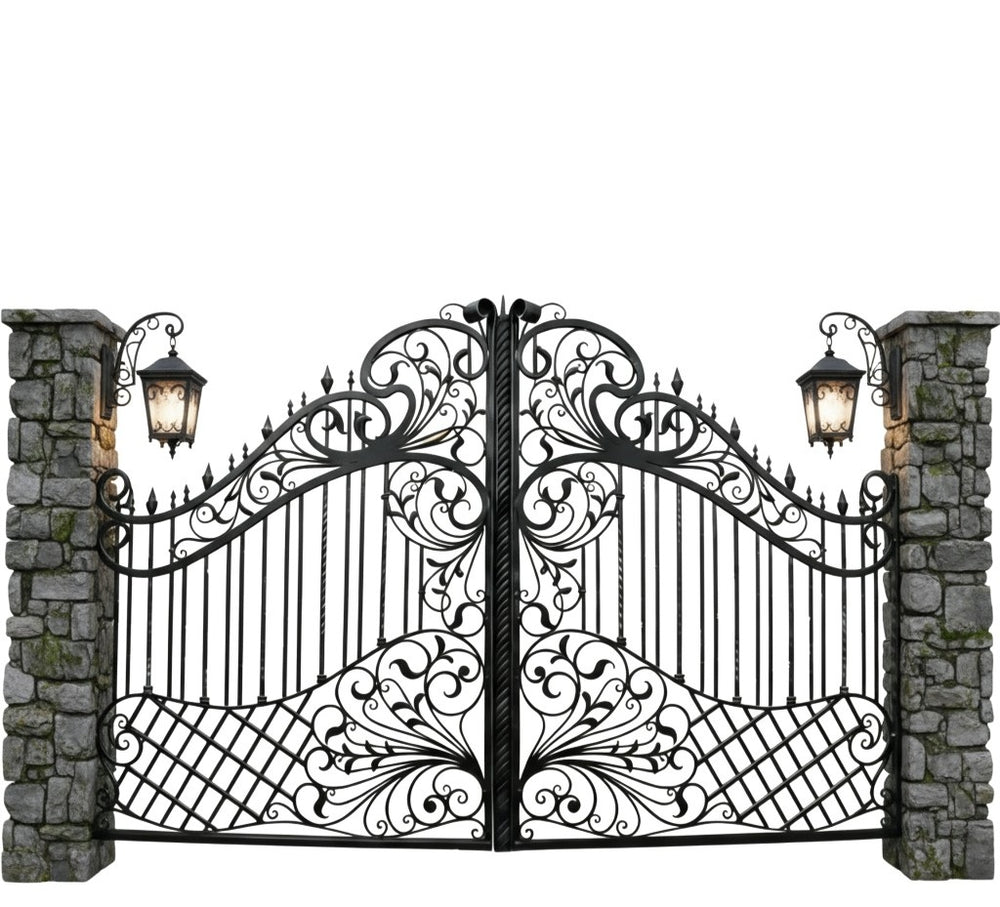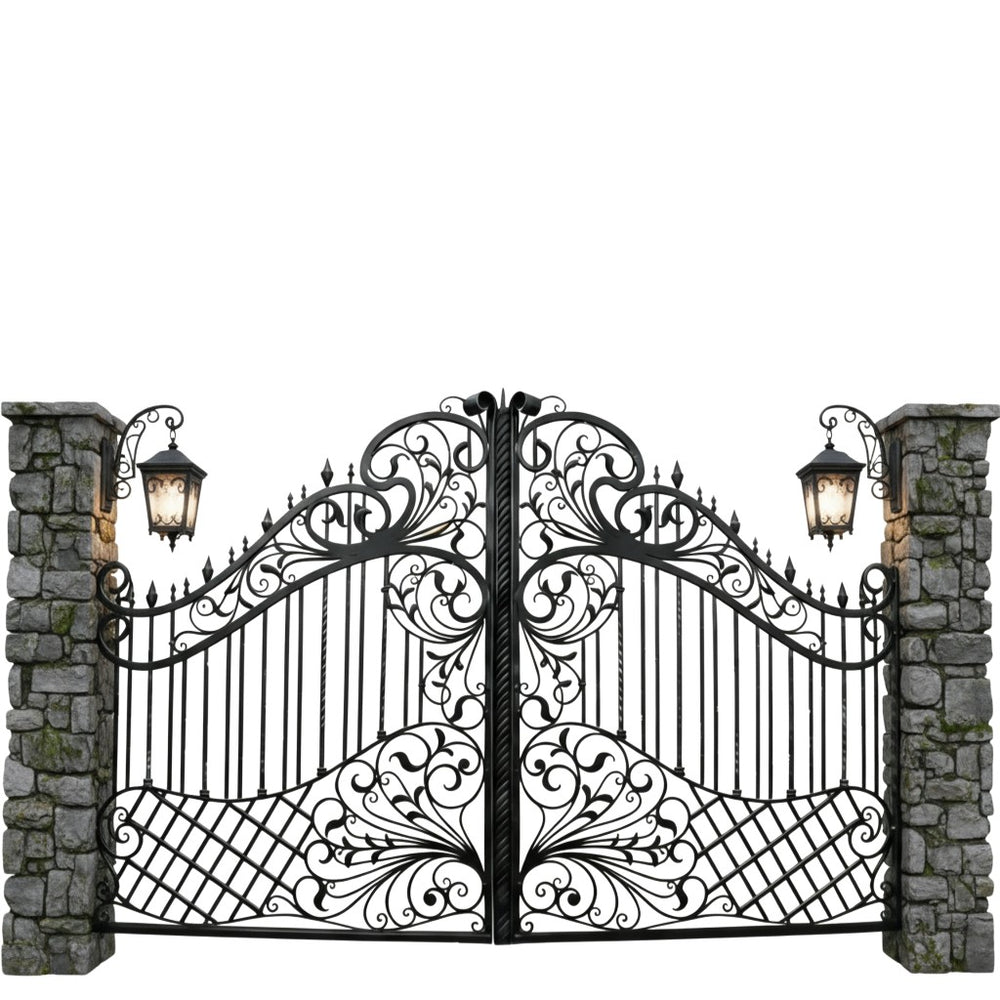 A gate that welcomes with warmth and grandeur. Lantern crest Bloom features dual swing panels adorned with swirling floral scrolls and a central crest emblem that anchors the design in legacy and refinement. The arched top is lined with pointed finials for vertical drama, while the flanking stone pillars—each crowned with vintage lanterns—cast a soft glow that enhances the gate’s romantic presence. This design evokes elegance, security, and timeless artistry.