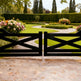 Welcome guests with strength and symmetry. Lantern Cross Manor features a double swing gate with bold crisscross geometry, vertical bar reinforcement, and a matte black finish. Framed by stacked stone pillars topped with traditional lanterns, this gate offers both security and elegance—perfect for estates that blend rustic textures with refined architectural detail.