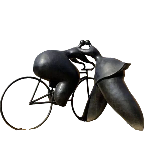 Artistic Excellence: Handcrafted using the traditional lost wax method, this sculpture showcases the intricate details and lifelike representation of two figures sharing a kiss while riding a bicycle.