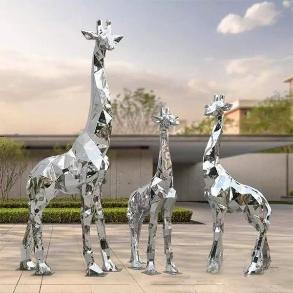 Add a touch of modern elegance to your outdoor space with our Reflective Giraffe Sculptures. These life-sized statues, crafted from mirrored surfaces, create a stunning visual effect by reflecting and fragmenting the surrounding environment. Perfect for making a bold statement in any garden or public area.