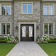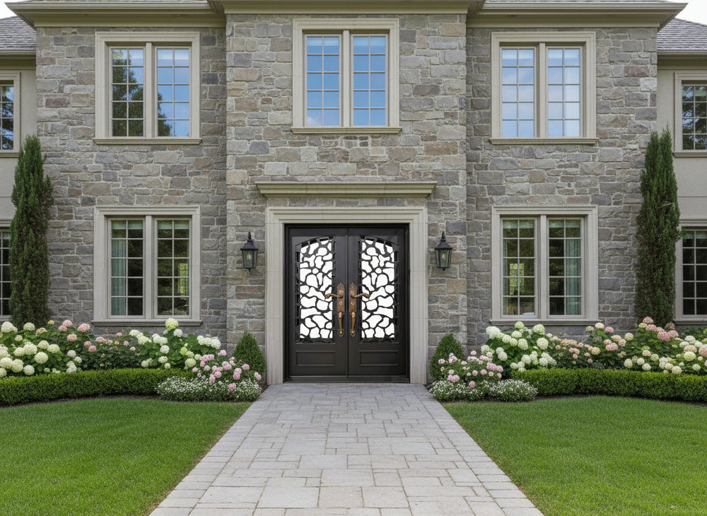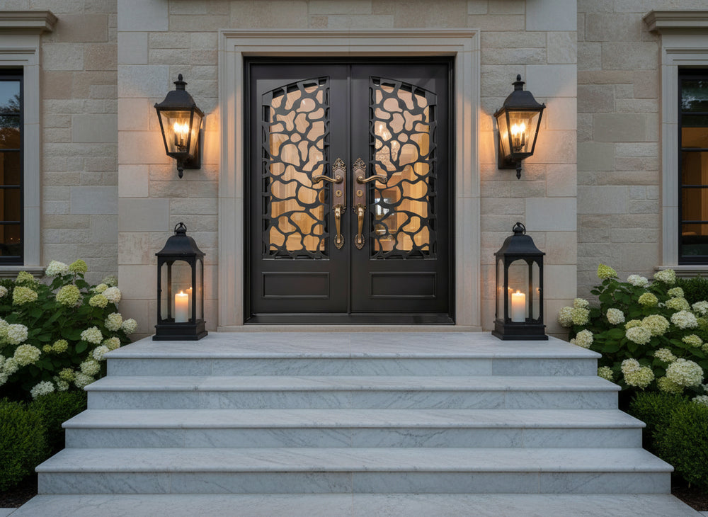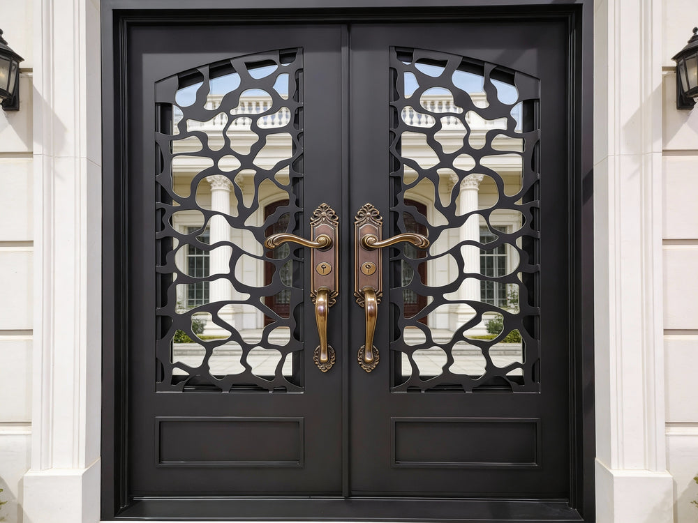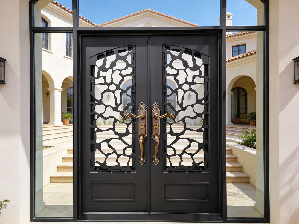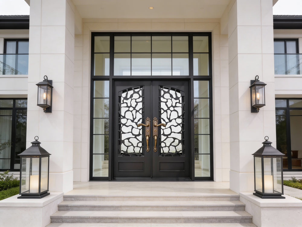 Laser-cut wrought iron front door, modern square top steel entry door Canada, custom galvanized iron doors, hot-dipped corrosion-resistant doors, powder-coated black metal door design, thermal insulated glass entry doors, decorative steel door with kickplate, handcrafted iron entrance, energy-efficient iron double door system, pre-hung custom iron door with glass panels