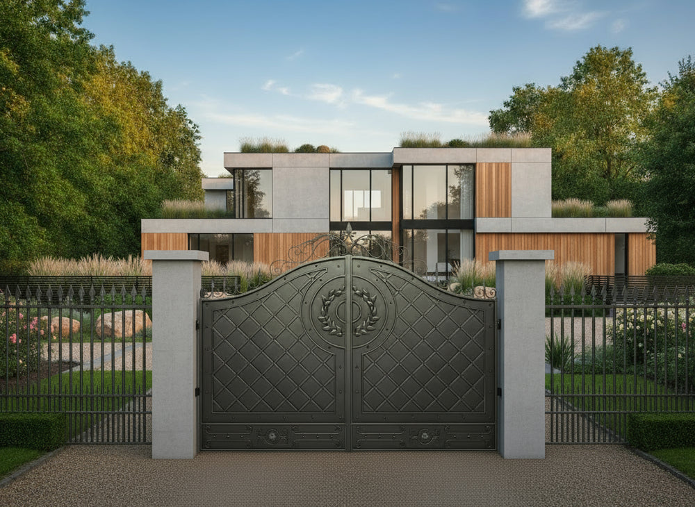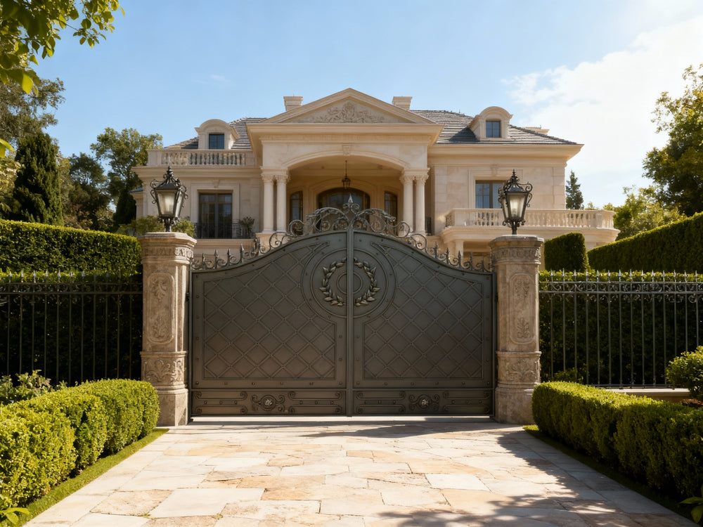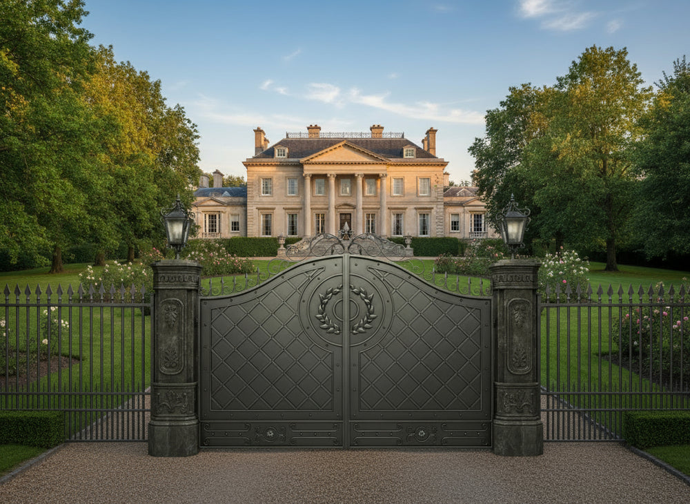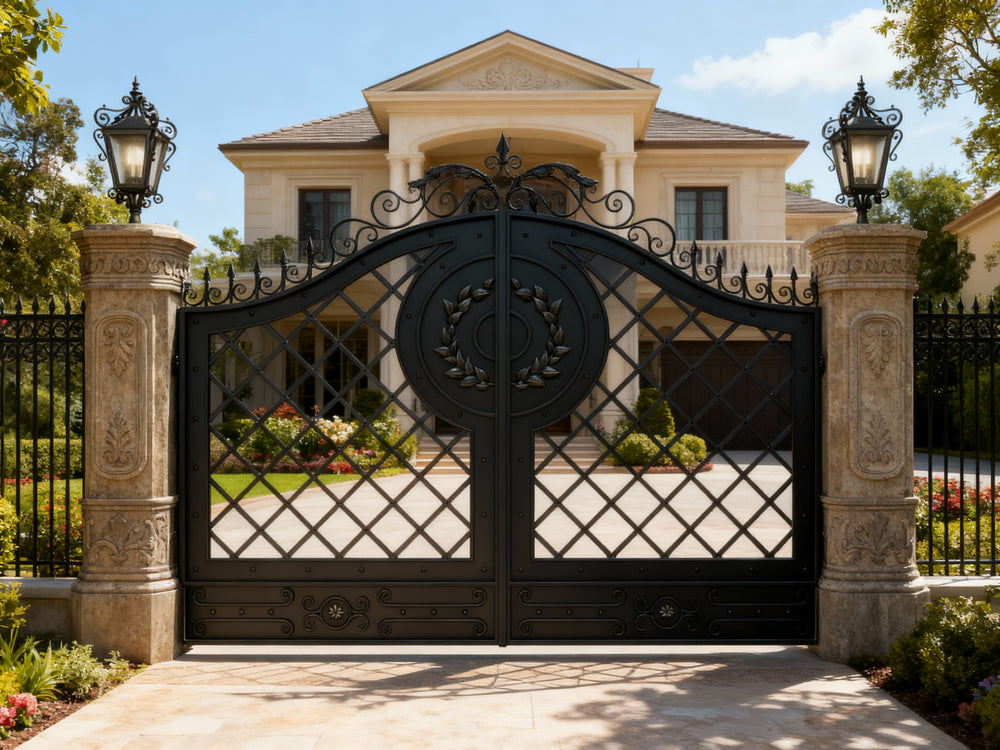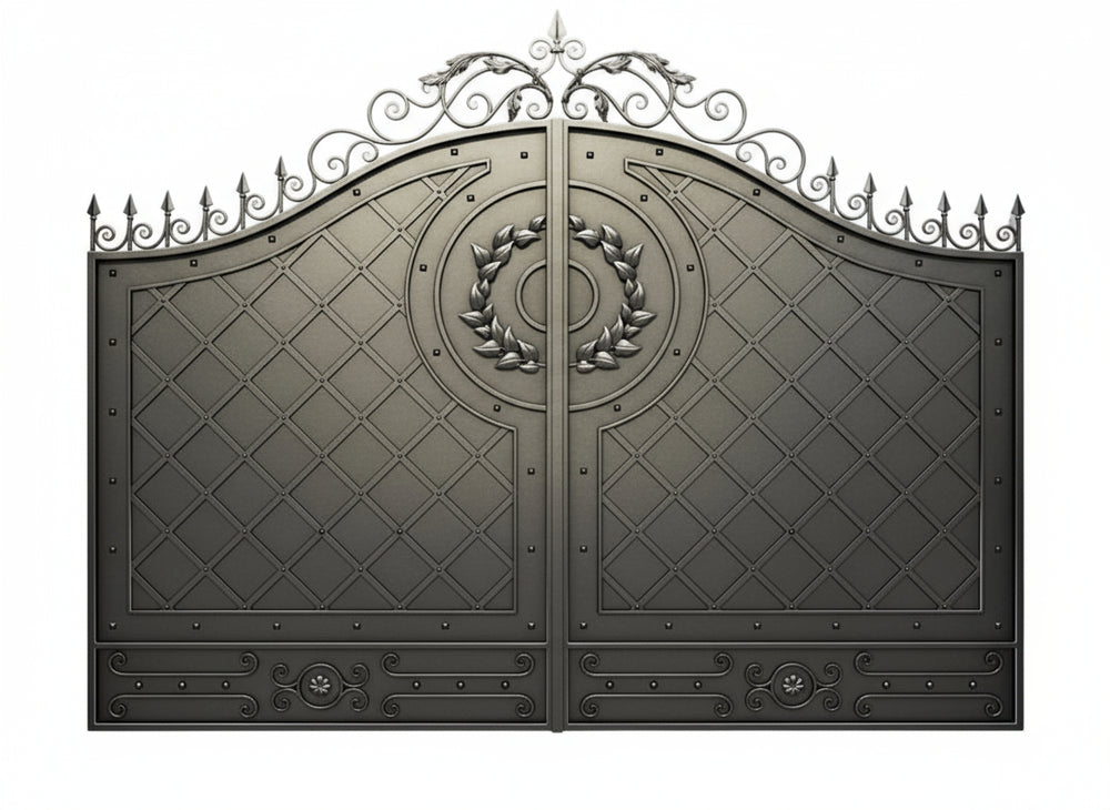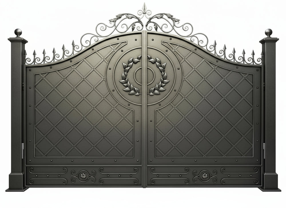 A gate that speaks in laurels and lattice. Laurel Crest Royale features dual swing panels crowned with intricate scrollwork and pointed finials, anchored by a central circular emblem framed in a laurel wreath—symbolizing victory, honour, and timeless elegance. The lower section showcases a diamond lattice pattern with riveted detailing, while the flanking stone pillars offer carved floral motifs and lantern-topped grandeur. Perfect for estates that blend classical architecture with ornamental prestige.