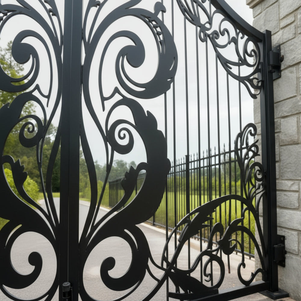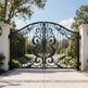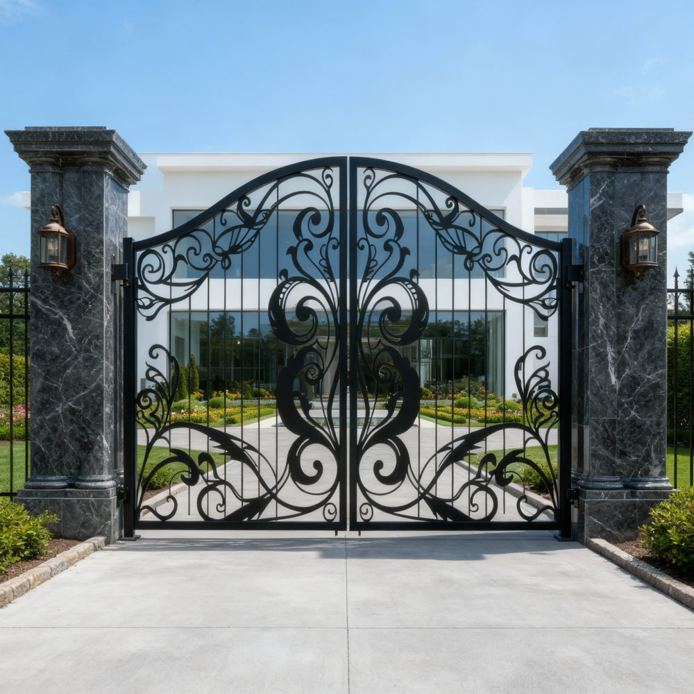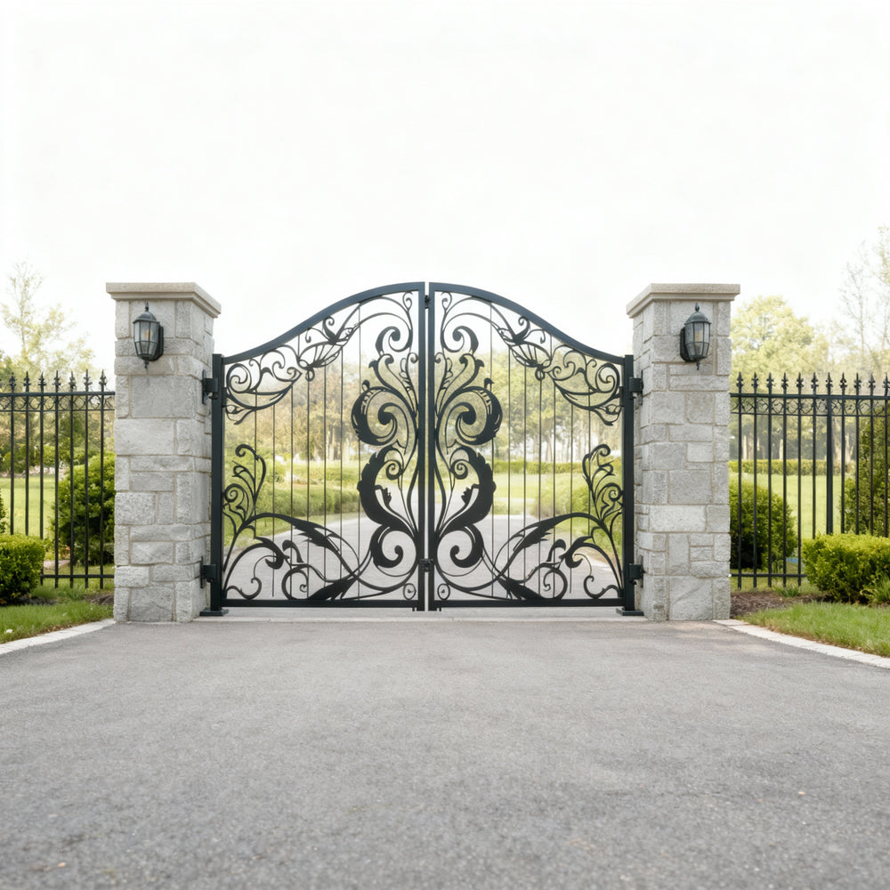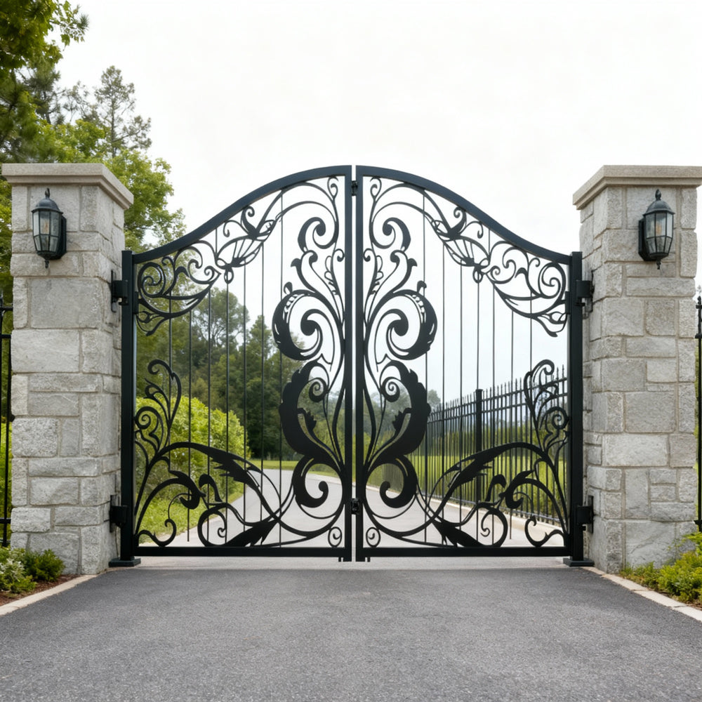 A gate that whispers refinement. Leafspire Estate Gate features dual swing panels adorned with mirrored floral and leaf scrollwork, crowned by an arched silhouette lined with pointed finials. The design flows with botanical rhythm, while the flanking white stone pillars frame the entrance in classical harmony. This gate evokes tranquillity, artistry, and timeless luxury—perfect for estates that value elegance and enclosure.