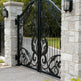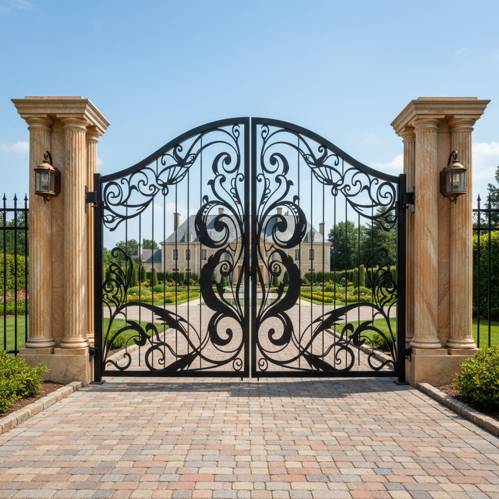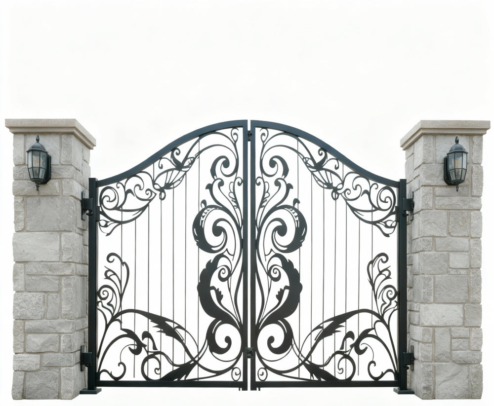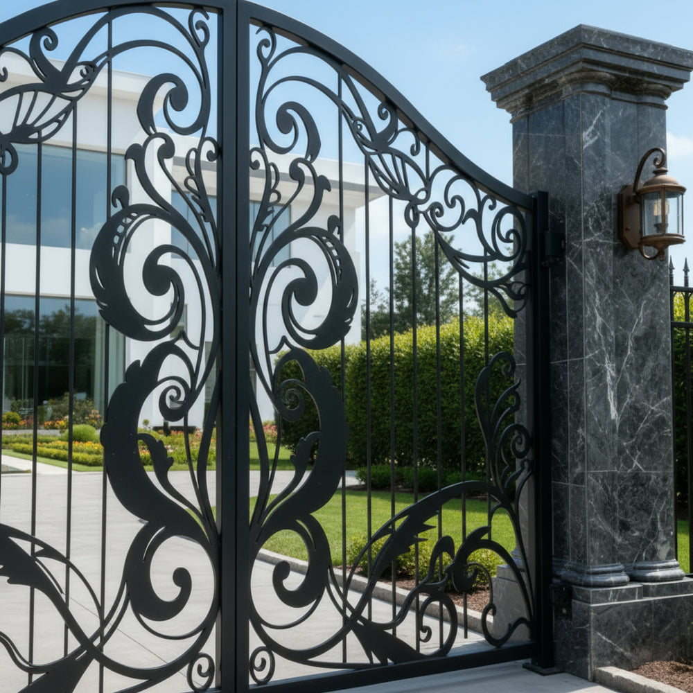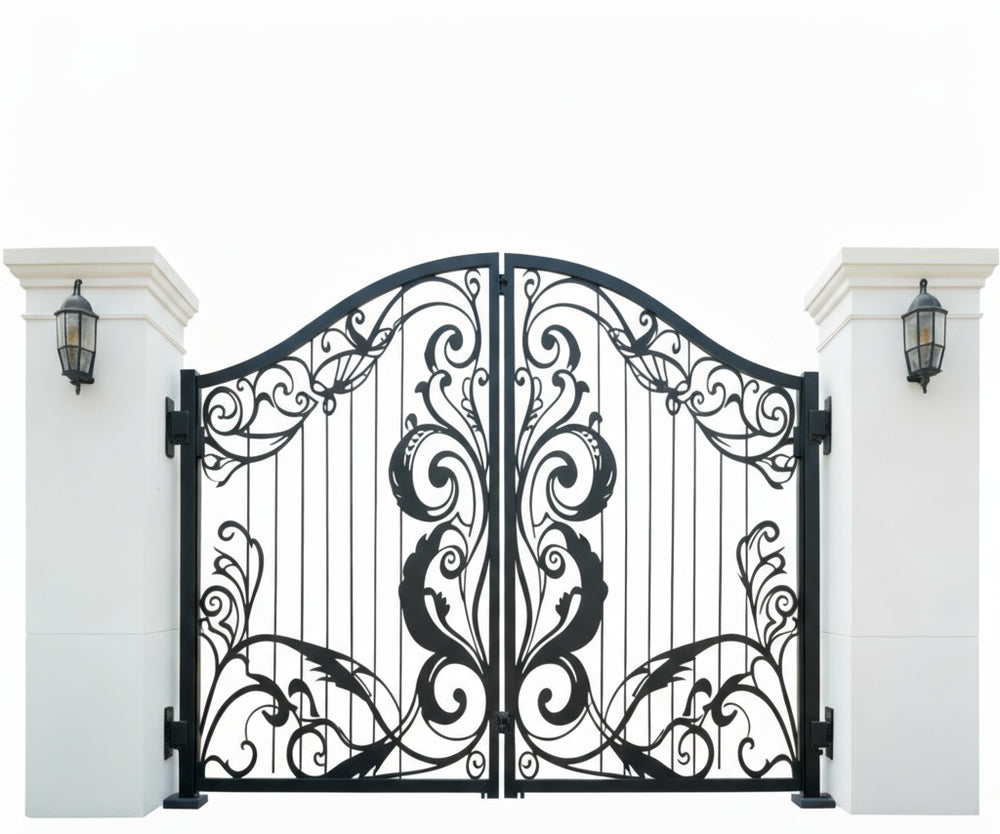 A gate that whispers refinement. Leafspire Estate Gate features dual swing panels adorned with mirrored floral and leaf scrollwork, crowned by an arched silhouette lined with pointed finials. The design flows with botanical rhythm, while the flanking white stone pillars frame the entrance in classical harmony. This gate evokes tranquillity, artistry, and timeless luxury—perfect for estates that value elegance and enclosure.