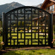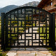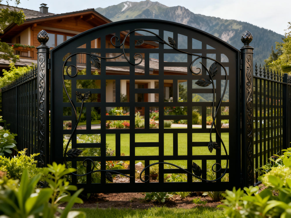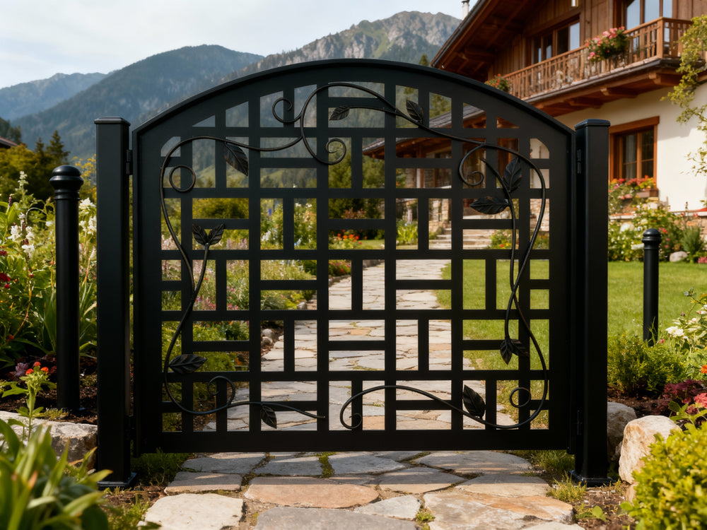 A door where geometry meets nature. Leafgrid Passage features a grid of rectangular and square bars arranged in a structured lattice, crowned by an arched top adorned with flowing vine and leaf motifs. The fusion of modern symmetry and organic ornamentation makes this gate ideal for garden entries, courtyard transitions, or residential passages that celebrate both order and artistry.