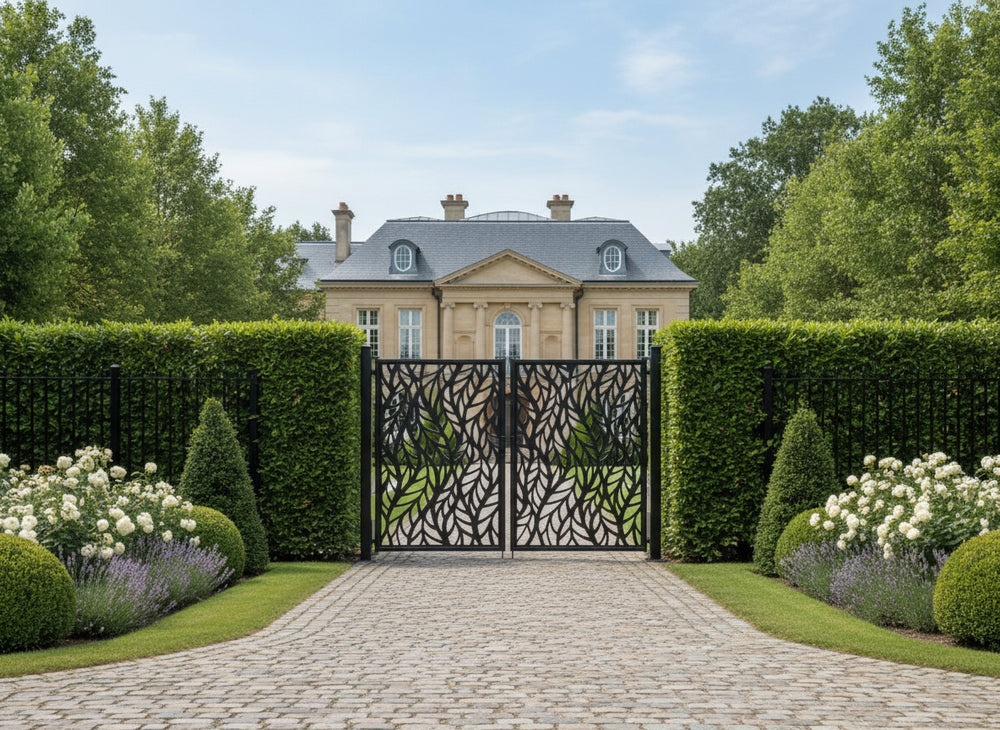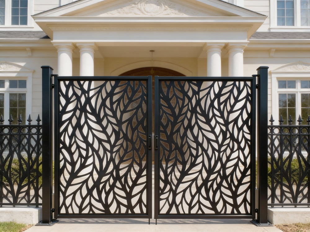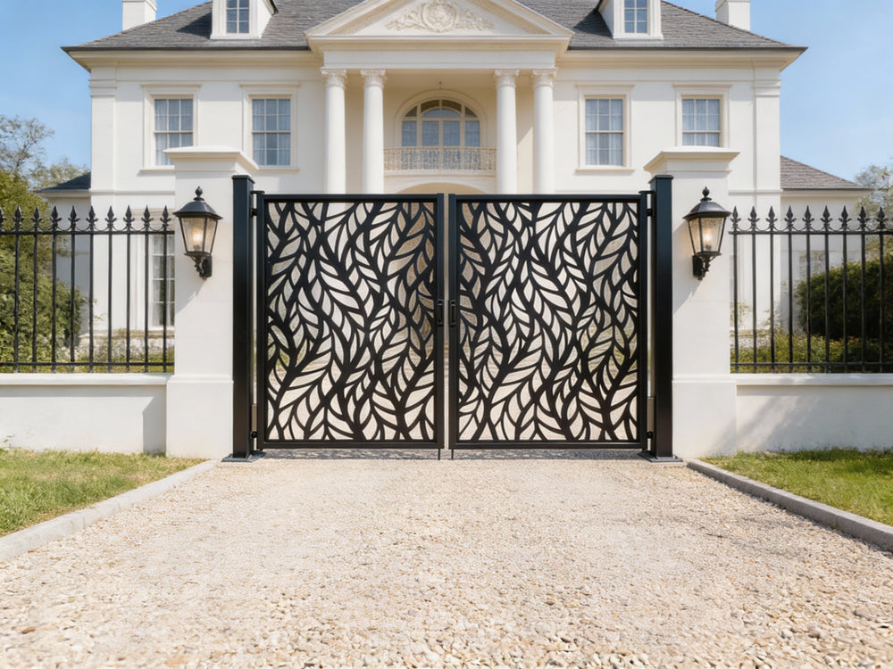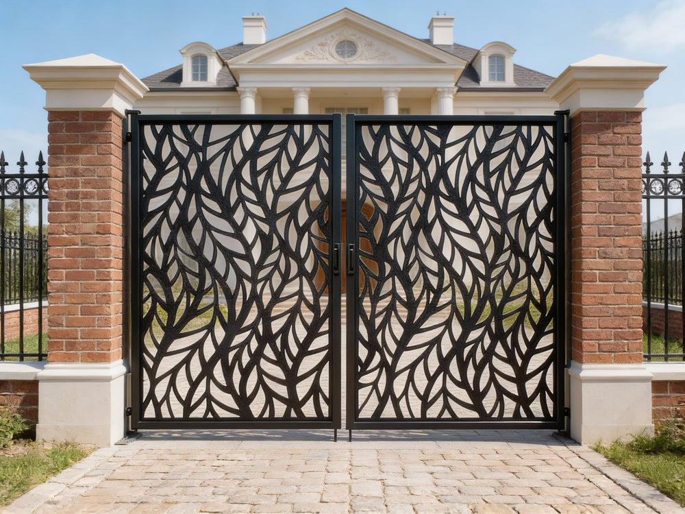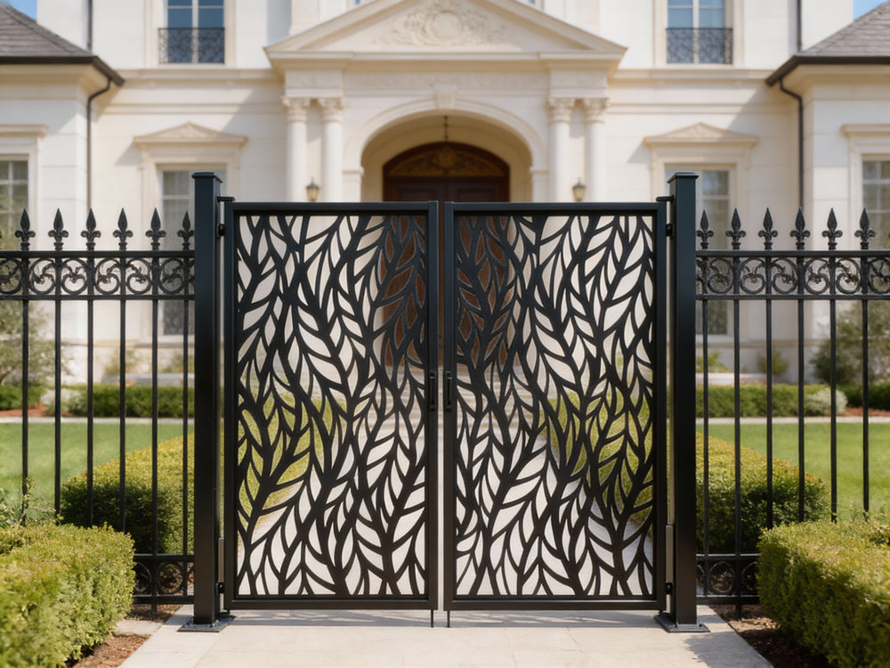 leaf lattice privacy gate, ornamental metal panel, garden screen entry, Canadian custom gate, Taimco Leafveil Passage model, manual operation decorative door