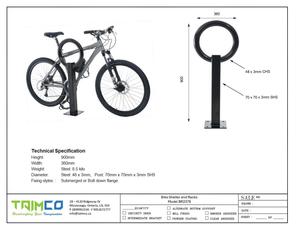 TAIMCO is a variation of the Rack with a touch of flair. Its graceful shape allows bicycles to be parked without twisting. it is offered in heavy-duty, round and square tubing.