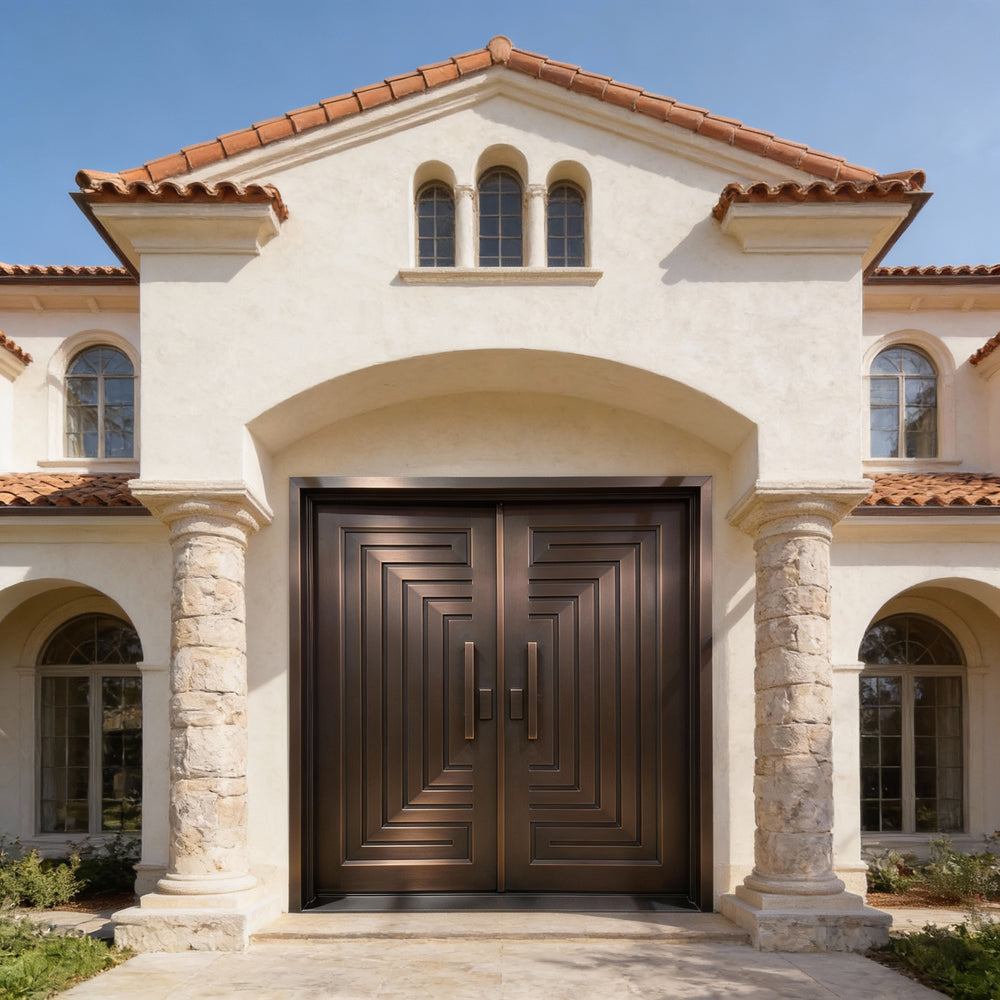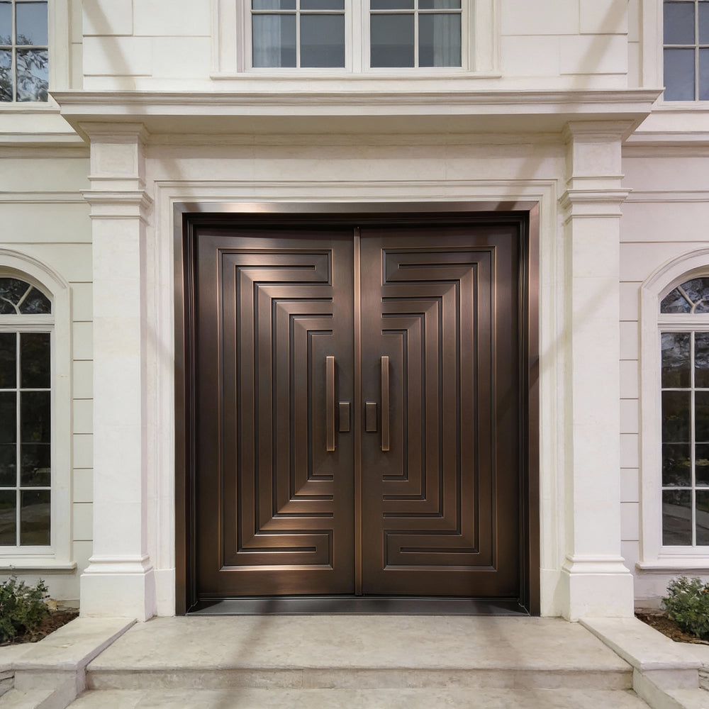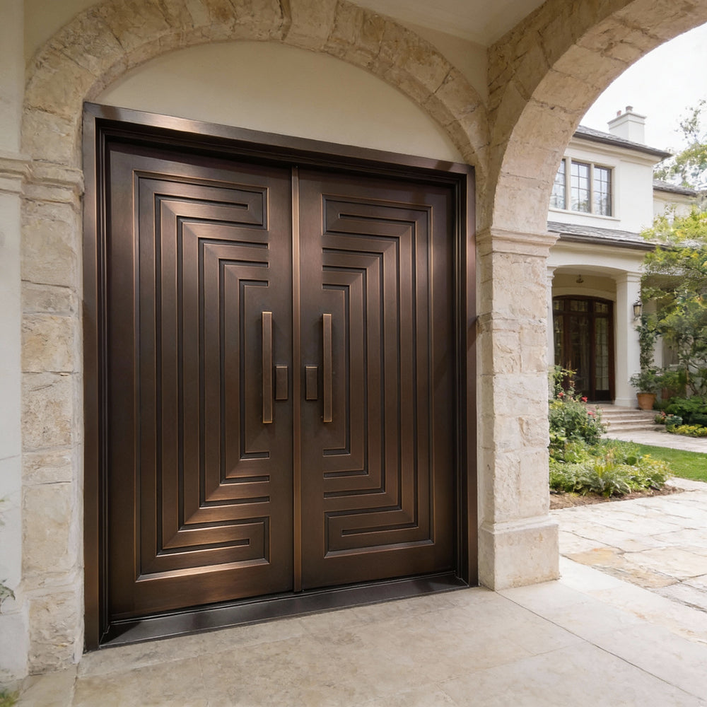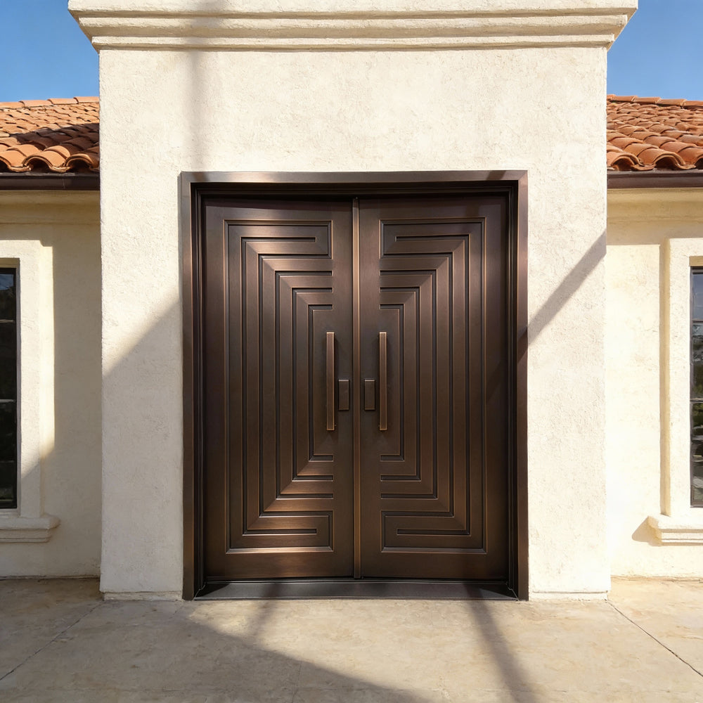 Luxury Wrought Iron Door with 3D Nested Angle Design – Double Panel Bronze Finish Model # IWD898