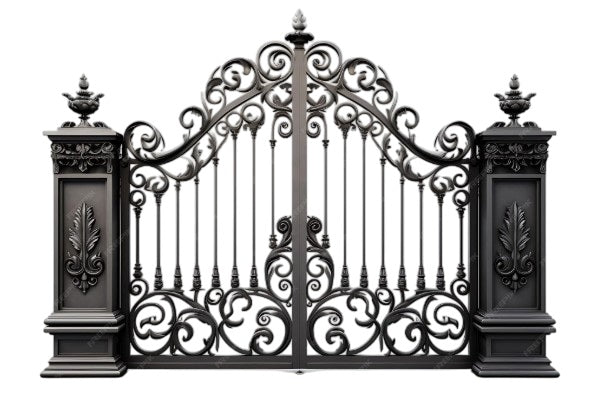 Make a statement of timeless elegance with Majestic Arborcrest, a double-leaf wrought iron driveway gate designed for grand entrances and heritage estates. Featuring symmetrical scrollwork, floral motifs, and a crowned arch with a central finial, this gate blends classical artistry with modern durability. Flanked by carved stone pillars topped with urns, it’s the kind of entrance that whispers prestige before you even step inside.