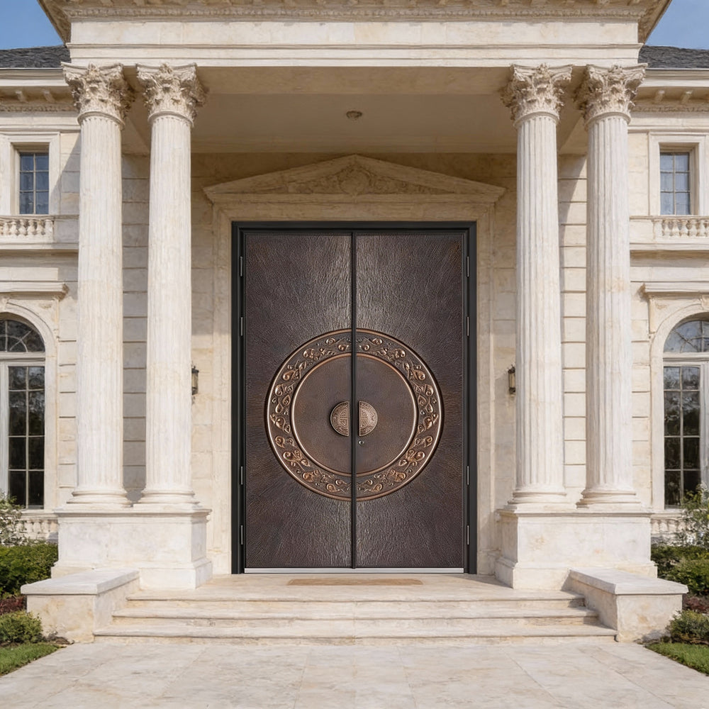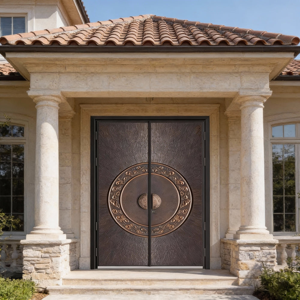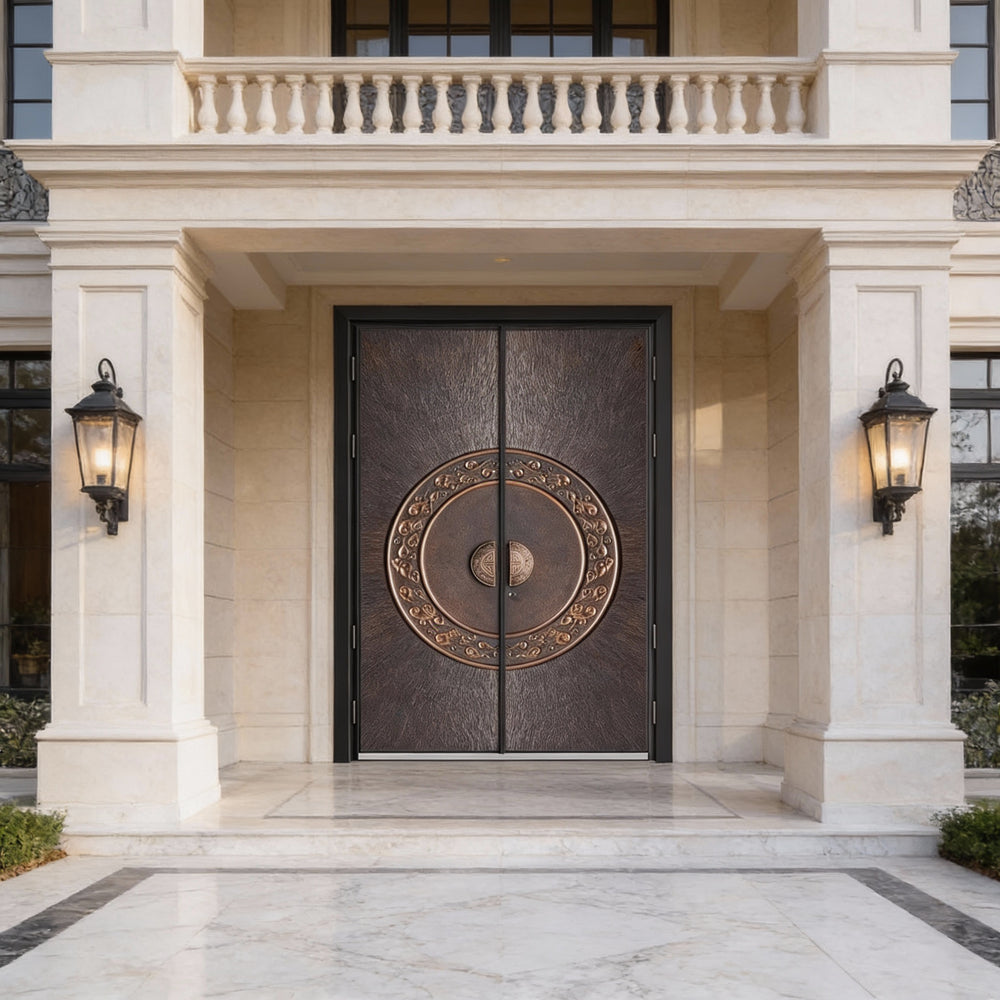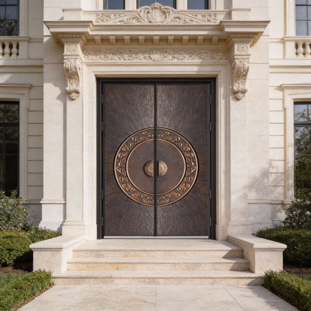 A bold fusion of ornamental artistry and architectural strength, the Mandacirque Passage is a handcrafted steel double door designed to elevate any residential entrance. Its centerpiece—a bronze mandala split across both panels—draws inspiration from East Asian scrollwork, offering a sense of balance, symmetry, and cultural depth. Crafted to meet Ontario Building Code standards, this door combines aesthetic elegance with structural integrity, making it ideal for luxury homes, ceremonial spaces, or statement entryways. Whether installed as a main entrance or a feature door, the Mandacirque Passage delivers timeless beauty with modern durability.