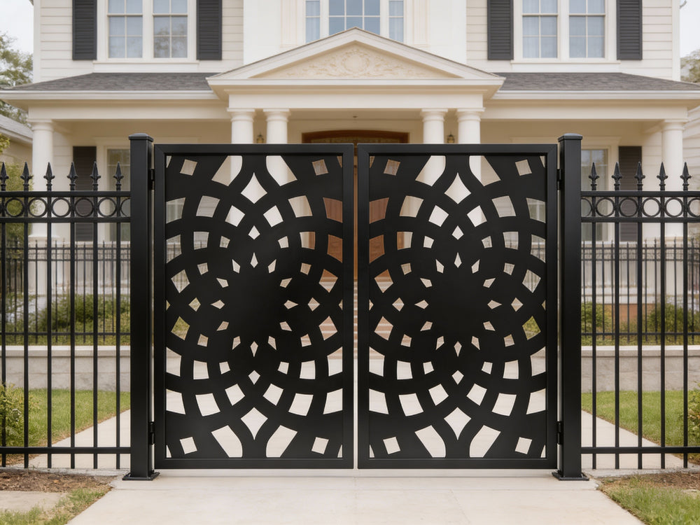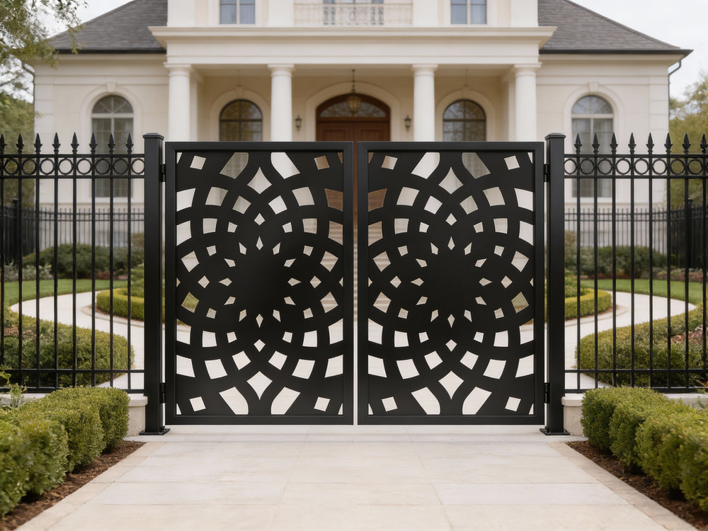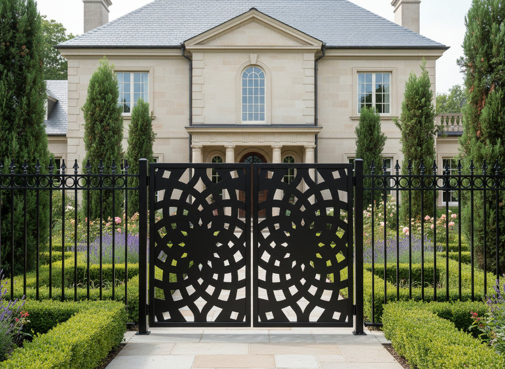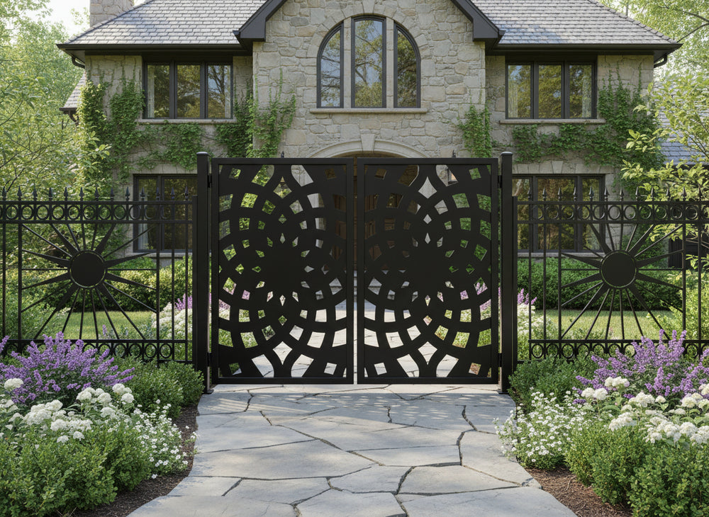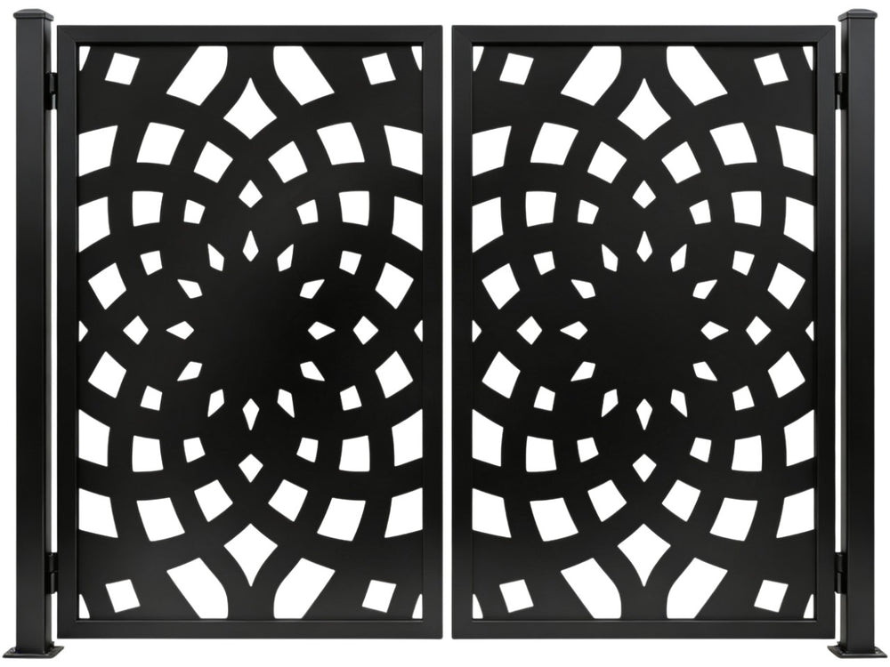 mandala lattice man door, ornamental metal gate, kaleidoscope pattern garden entry, Canadian custom gate, Taimco Mandalux Passage model, manual operation decorative door