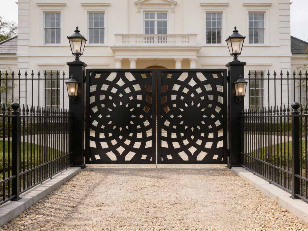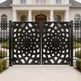 A door that reflects symmetry and depth. Mandalux Passage features two symmetrical panels framed in matte black, each showcasing a complex arrangement of interlocking shapes that evoke the structure of a mandala or kaleidoscope. The laser-cut pattern offers partial visibility and airflow while delivering bold visual impact. Ideal for garden entries, architectural walkways, or boutique transitions, this man door blends geometric intricacy with secure craftsmanship.