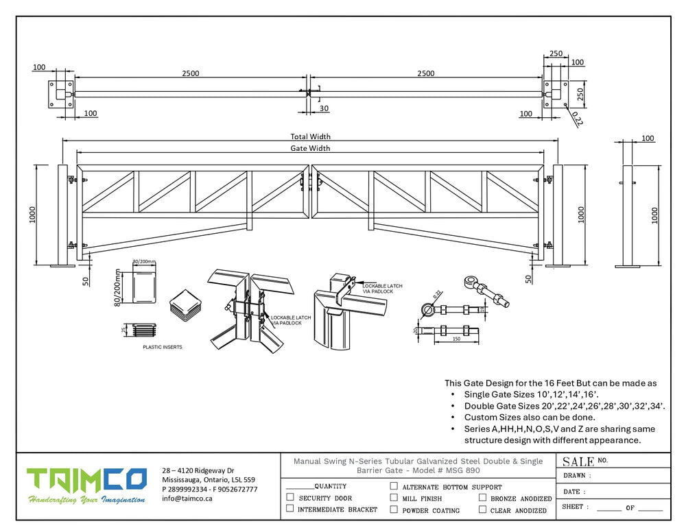 These Gates are available in Double or single configurations and Galvanized or powder-coated options. Custom-built sizes and configurations are available as well. Please get in touch with us for all custom-size requests.