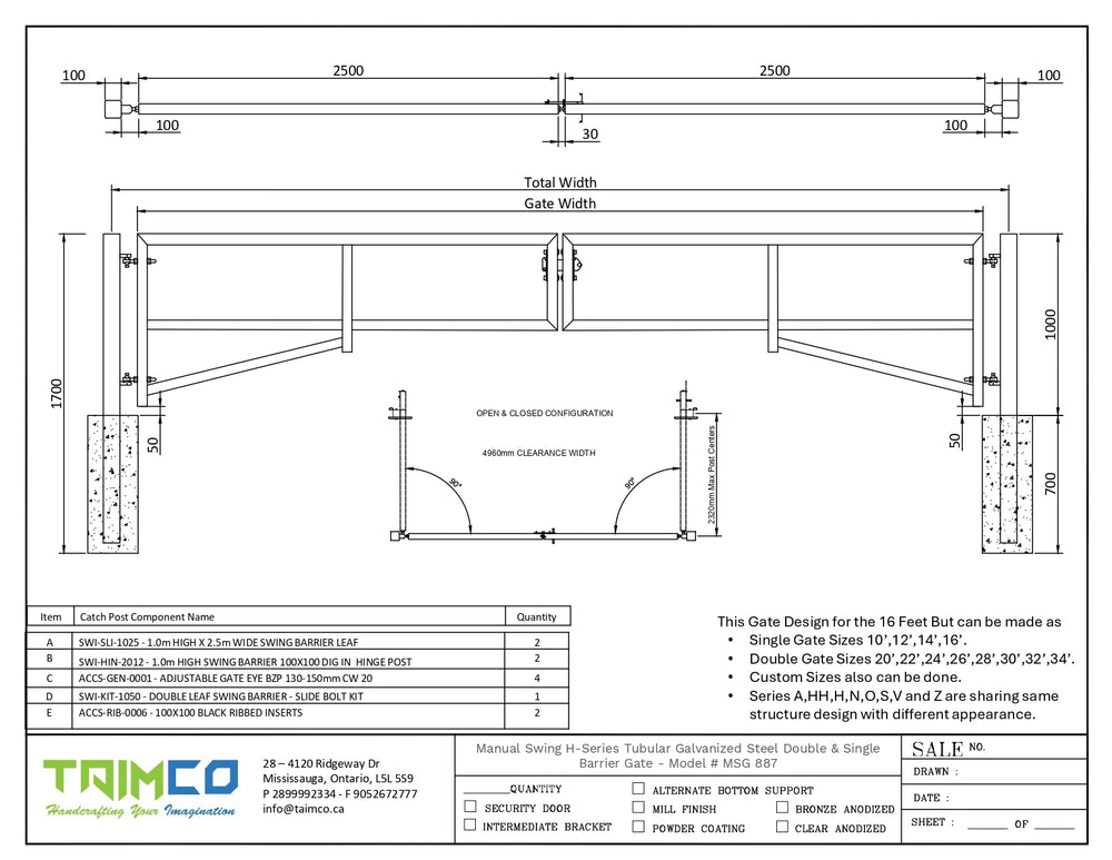 These Gates are available in Double or single configurations and Galvanized or powder-coated options. Custom-built sizes and configurations are available as well. Please get in touch with us for all custom-size requests.