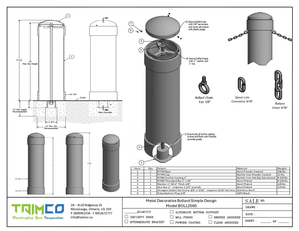 The BOLL2560 Decorative Bollard combines timeless elegance with robust functionality. Crafted from resilient carbon steel, this bollard features a wide body that accommodates larger pipe reinforcements up to 7-5/8″ in diameter, providing enhanced impact protection. The simple, classic design adds a touch of sophistication to any setting, while the durable powder coating ensures long-lasting protection against wear and corrosion.
