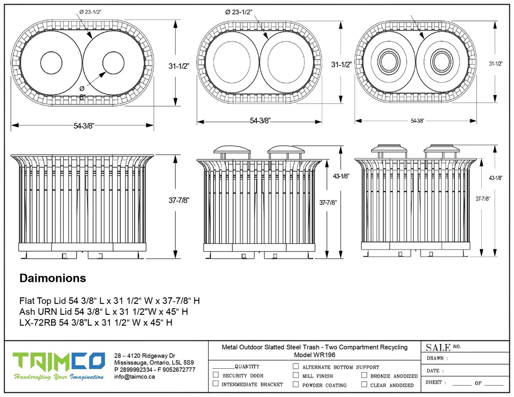 The TAIMCO WR196 is a dual-stream waste receptacle designed for efficiency and durability in high-volume environments. Crafted from 11-gauge tapered vertical slat steel, it offers strength and style while seamlessly accommodating two 32-gallon liners side by side. Its MIG-welded, all-steel construction is finished with a weather- and corrosion-resistant powder coating, ensuring robust performance in both indoor and outdoor spaces.