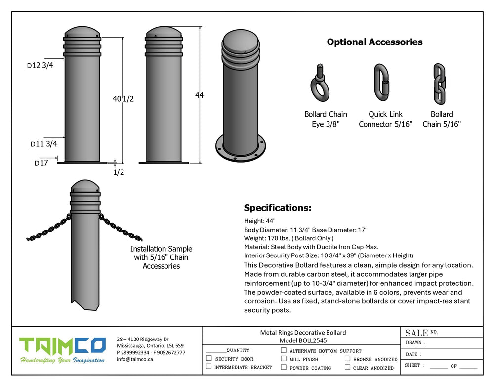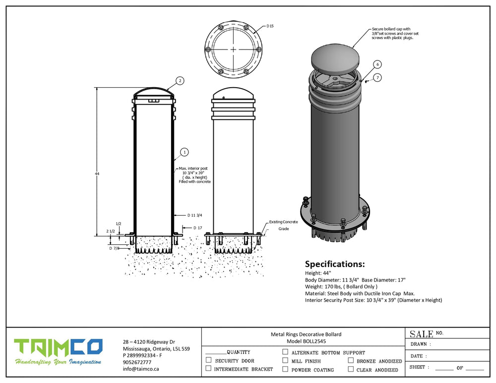 Metal Rings Decorative Bollard Simple Design - Powder Coted - Model BOLL2545