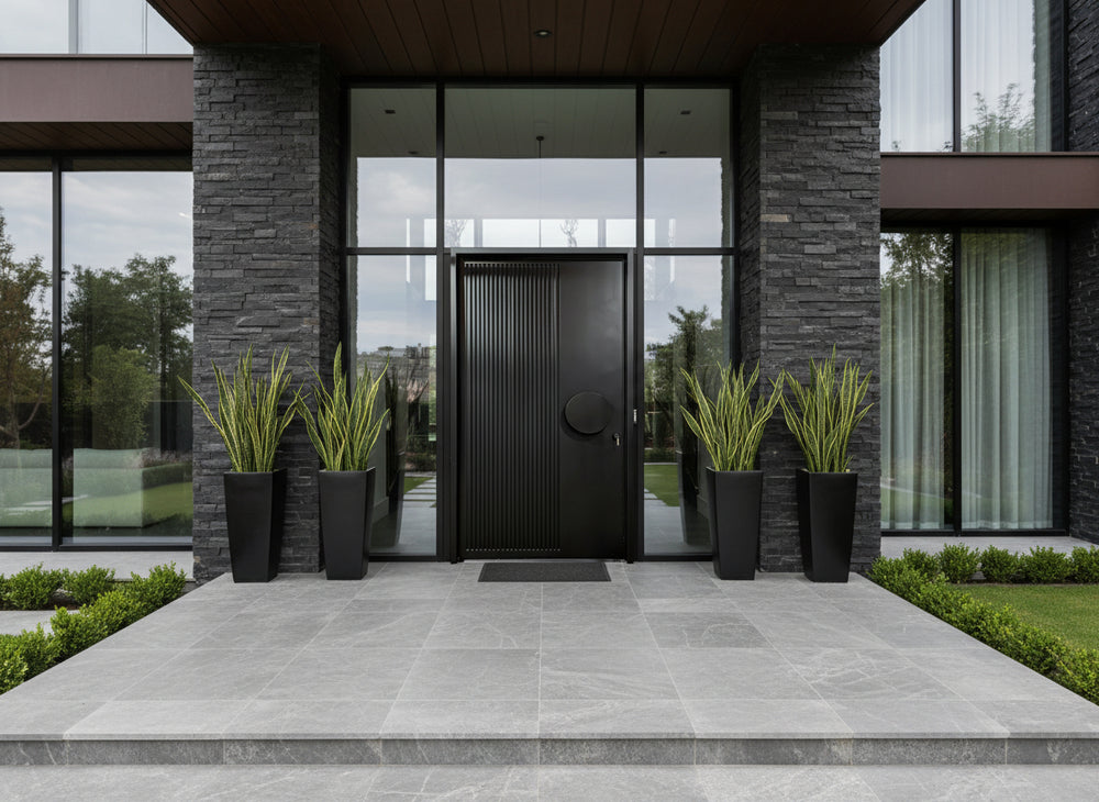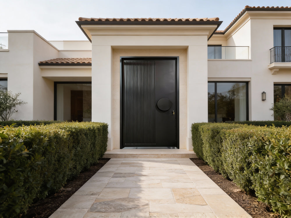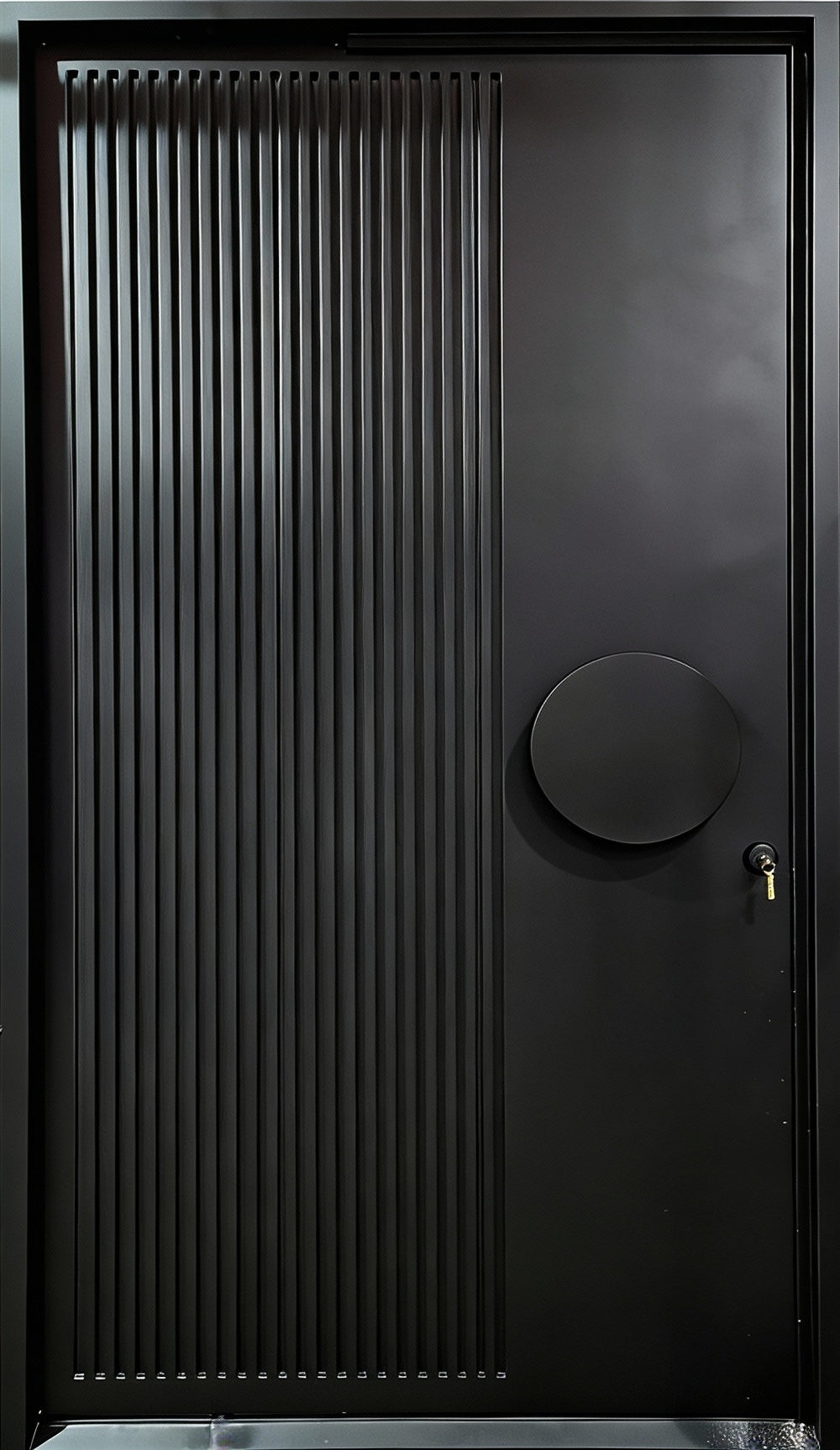 Discover the ultimate in minimalist design with this matte black iron entry door featuring a ribbed texture and oversized circular handle. Built from galvanized steel and powder-coated for long-lasting durability and rust resistance, this custom iron door is ideal for modern residential and commercial properties seeking a secure yet visually captivating entry solution. Whether upgrading your home’s curb appeal or designing a high-end storefront, this contemporary steel door offers bold style, excellent craftsmanship, and energy-efficient functionality. Shop luxury iron doors in Canada and USA with customizable options and free delivery.