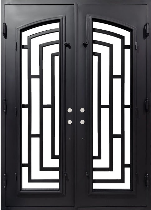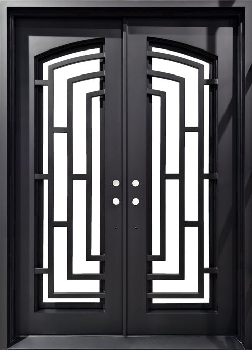 This square-top wrought iron double door embodies sleek modernism through its symmetrical rectangular grille pattern, formed via high-precision laser cutting. The uniform metal bars intersect cleanly to form a grid-like structure that offers both visual rhythm and enhanced structural support.