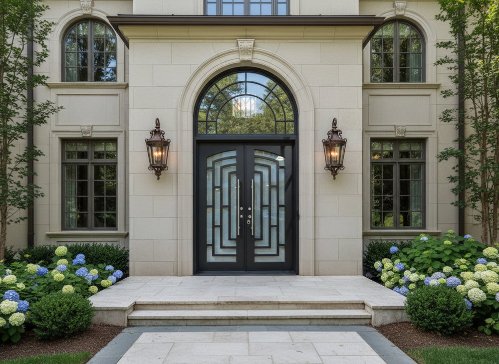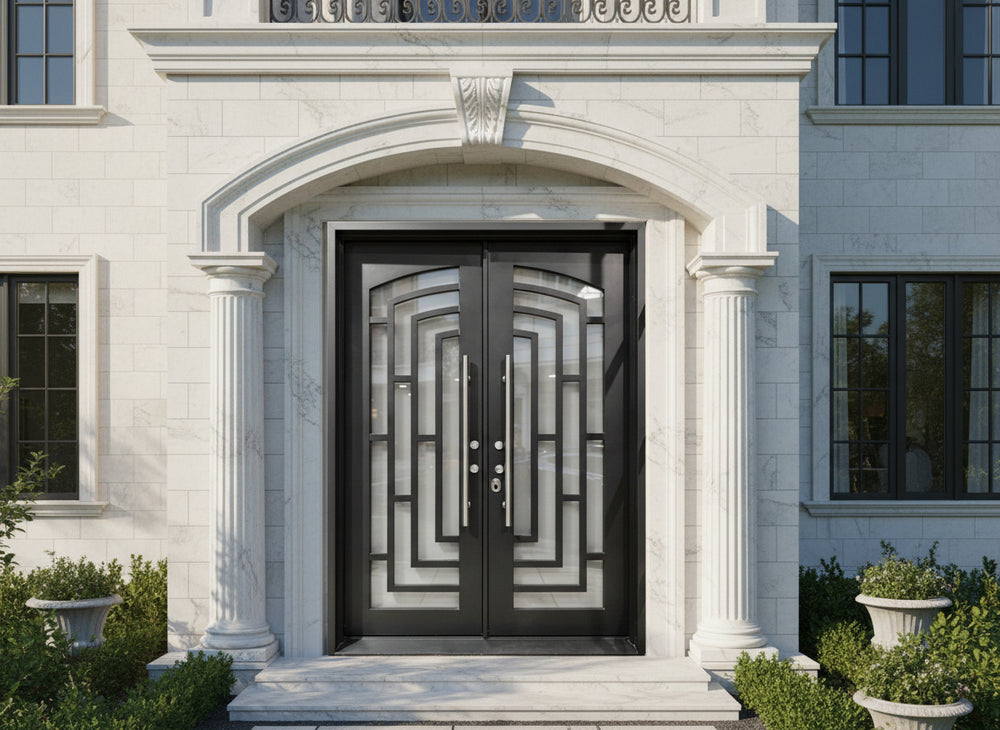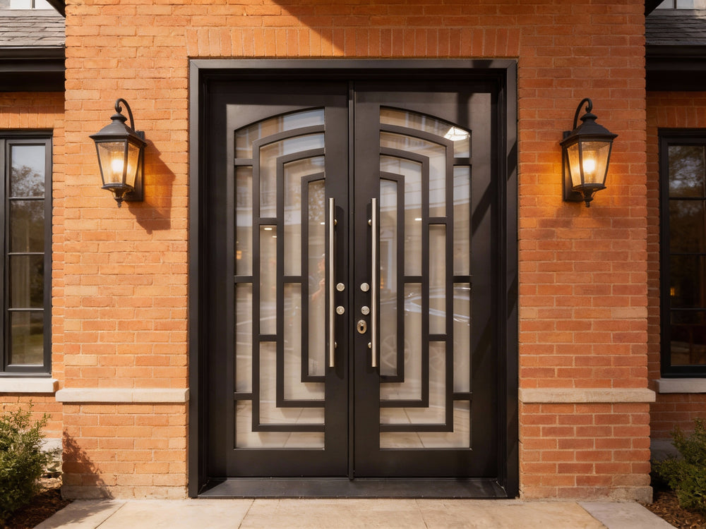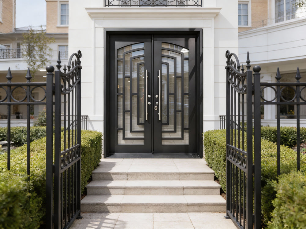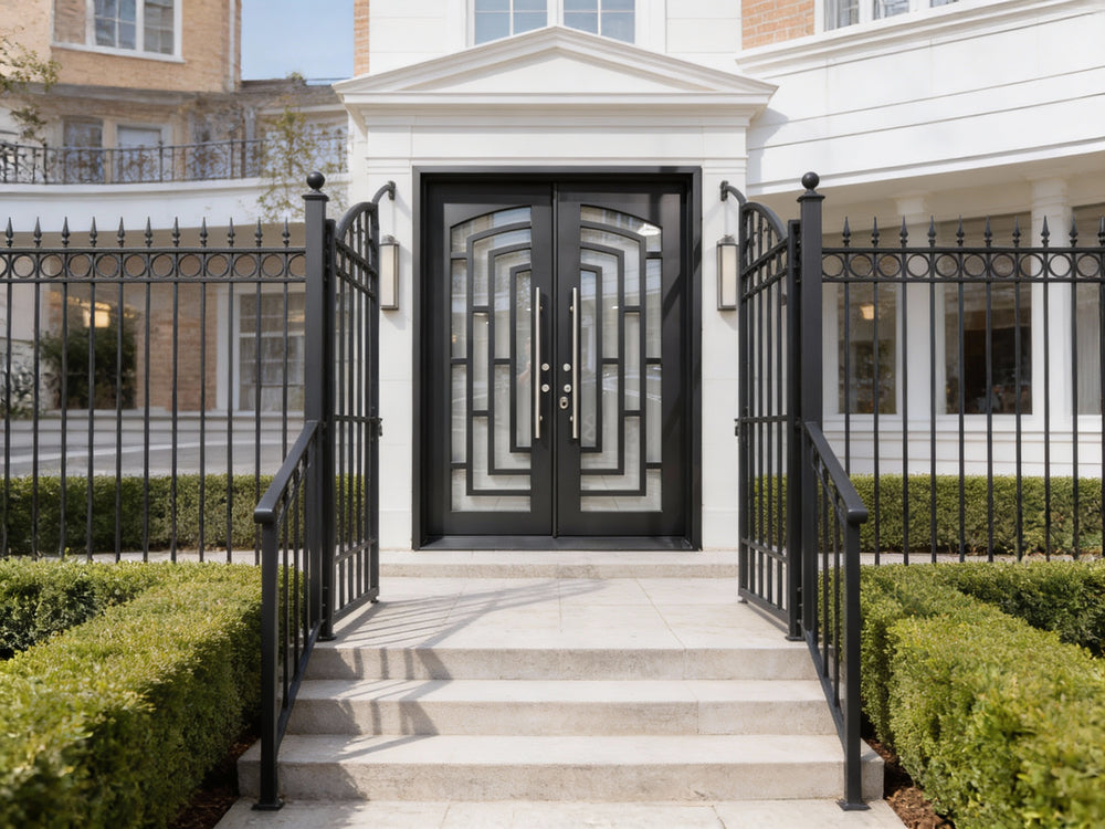 This square-top wrought iron double door embodies sleek modernism through its symmetrical rectangular grille pattern, formed via high-precision laser cutting. The uniform metal bars intersect cleanly to form a grid-like structure that offers both visual rhythm and enhanced structural support.
