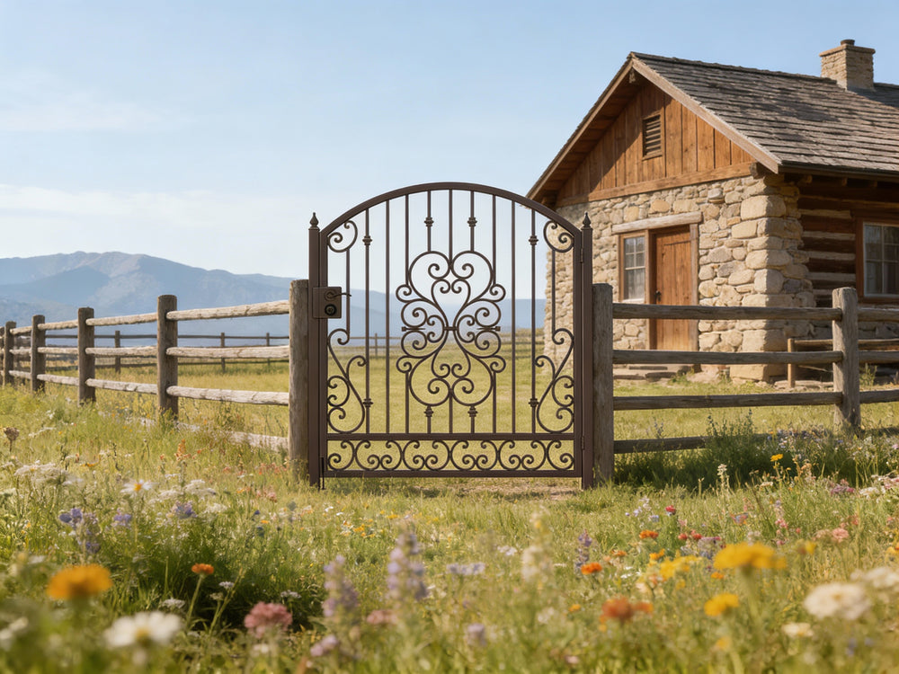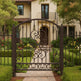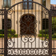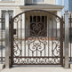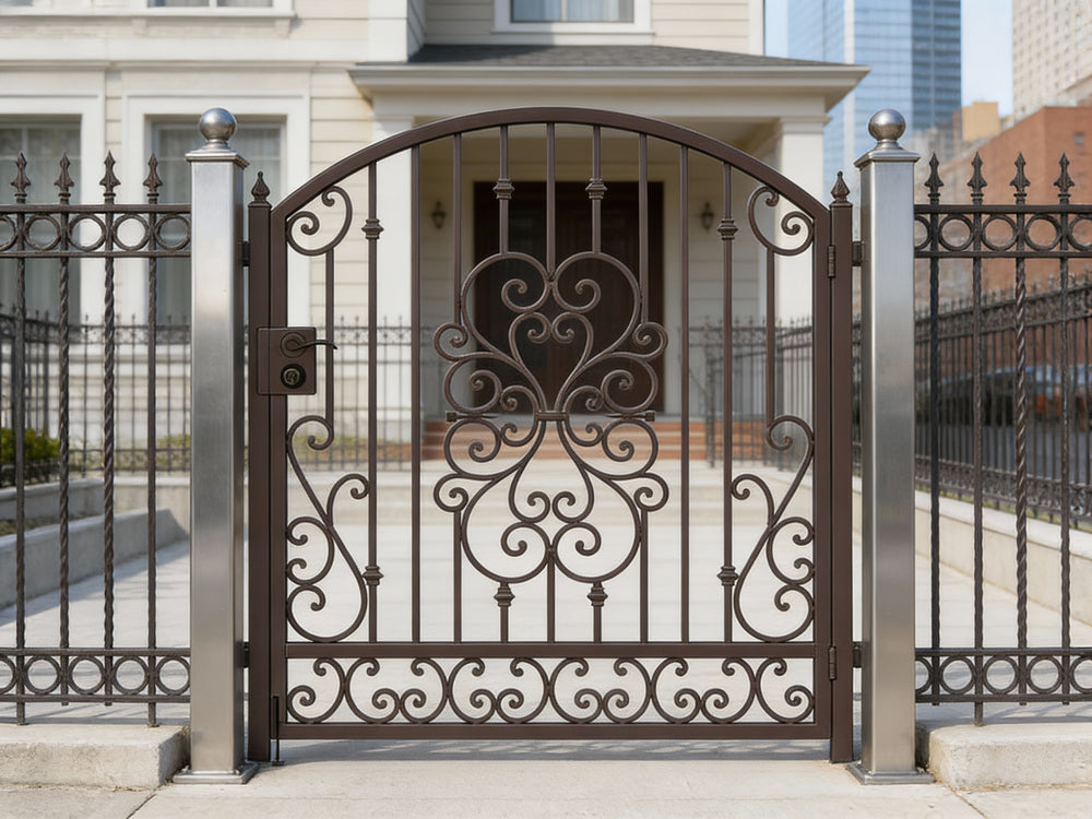 mirrored scroll man door, ornamental wrought iron gate, arched floral passage, Canadian custom gate, Taimco Mirrabelle model, manual operation garden entry