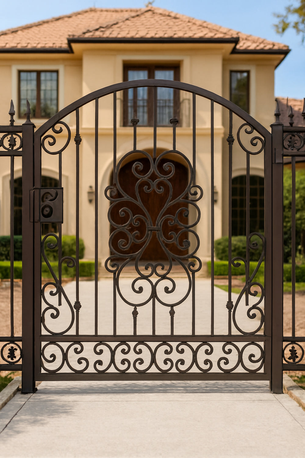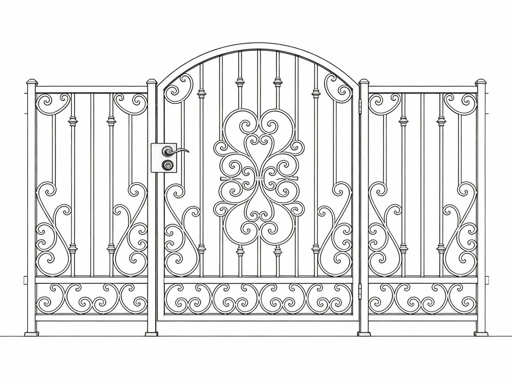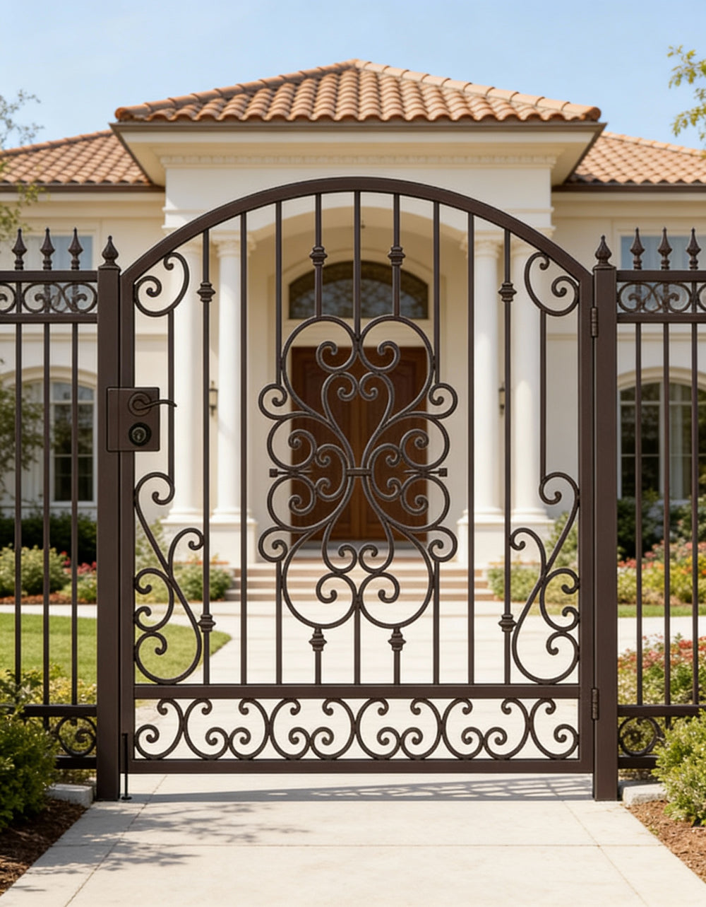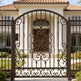 A door that reflects elegance. Mirrabelle Passage features a symmetrical twin-panel layout with a mirrored heart-scroll centerpiece, framed by vertical bars and crowned with a graceful arch. The bottom section adds rhythmic scrollwork, while the left-side latch and right-side hinge ensure smooth manual operation. Ideal for garden entries, courtyard transitions, or residential walkways, this man door blends ornamental charm with secure craftsmanship.