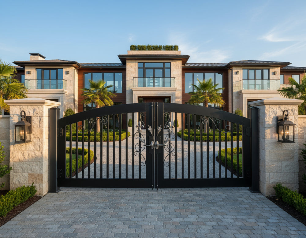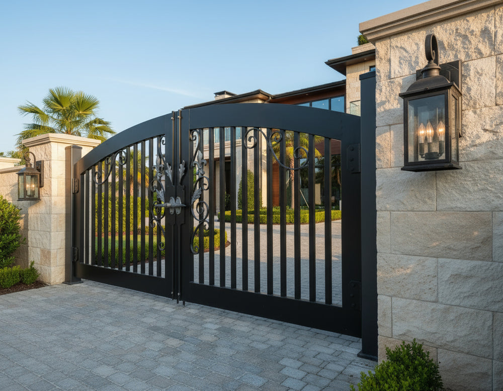 - Structure: Dual swing panels mounted on sturdy brick pillars